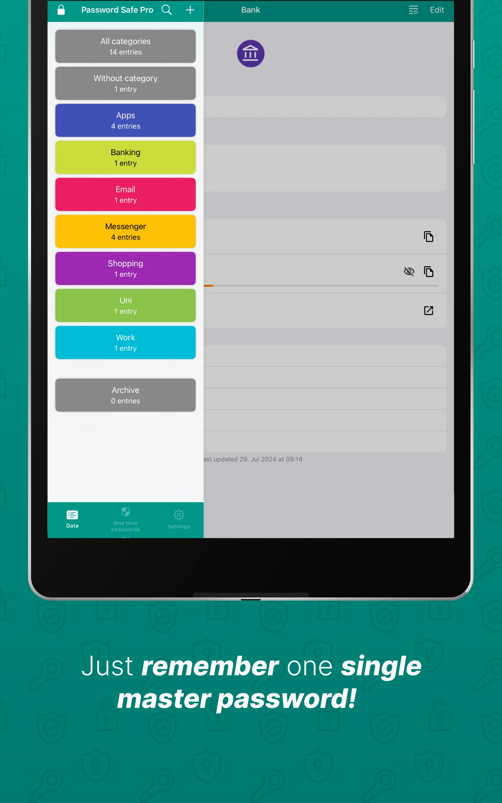Password Safe encrypts all your entered data, ensuring that your access information is securely stored. You only need to remember one master password.