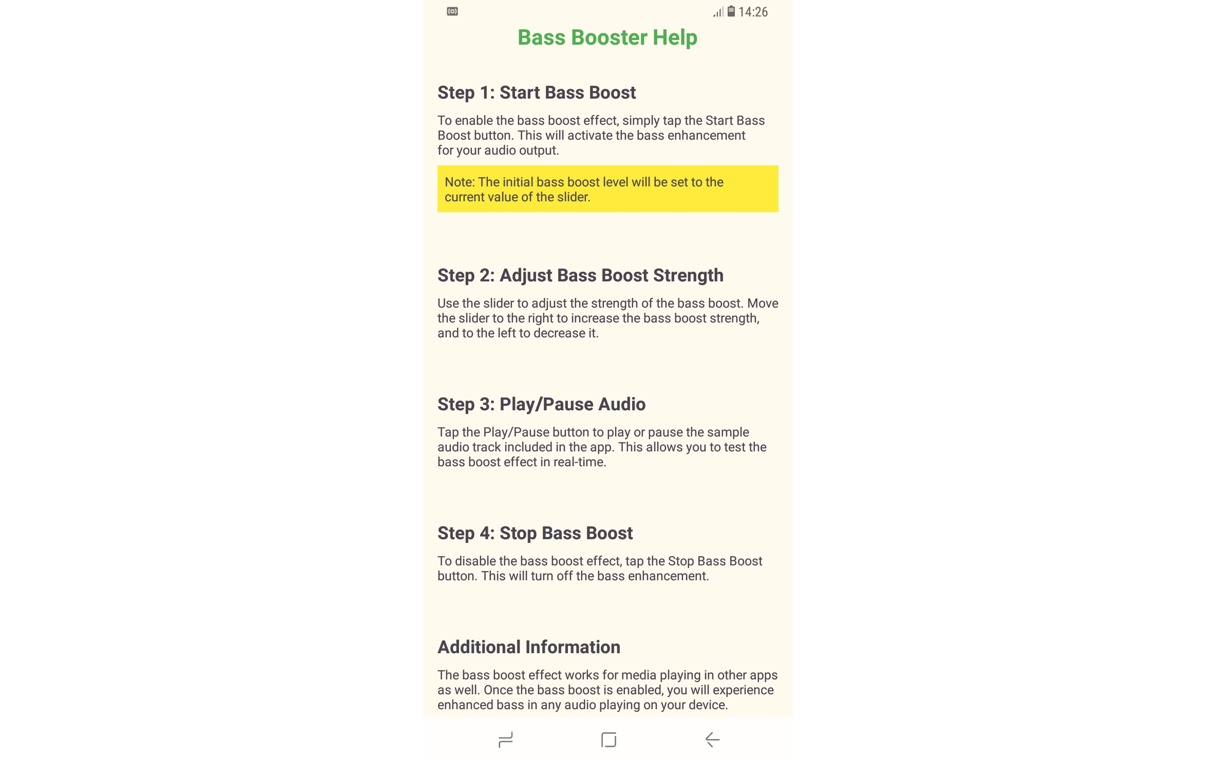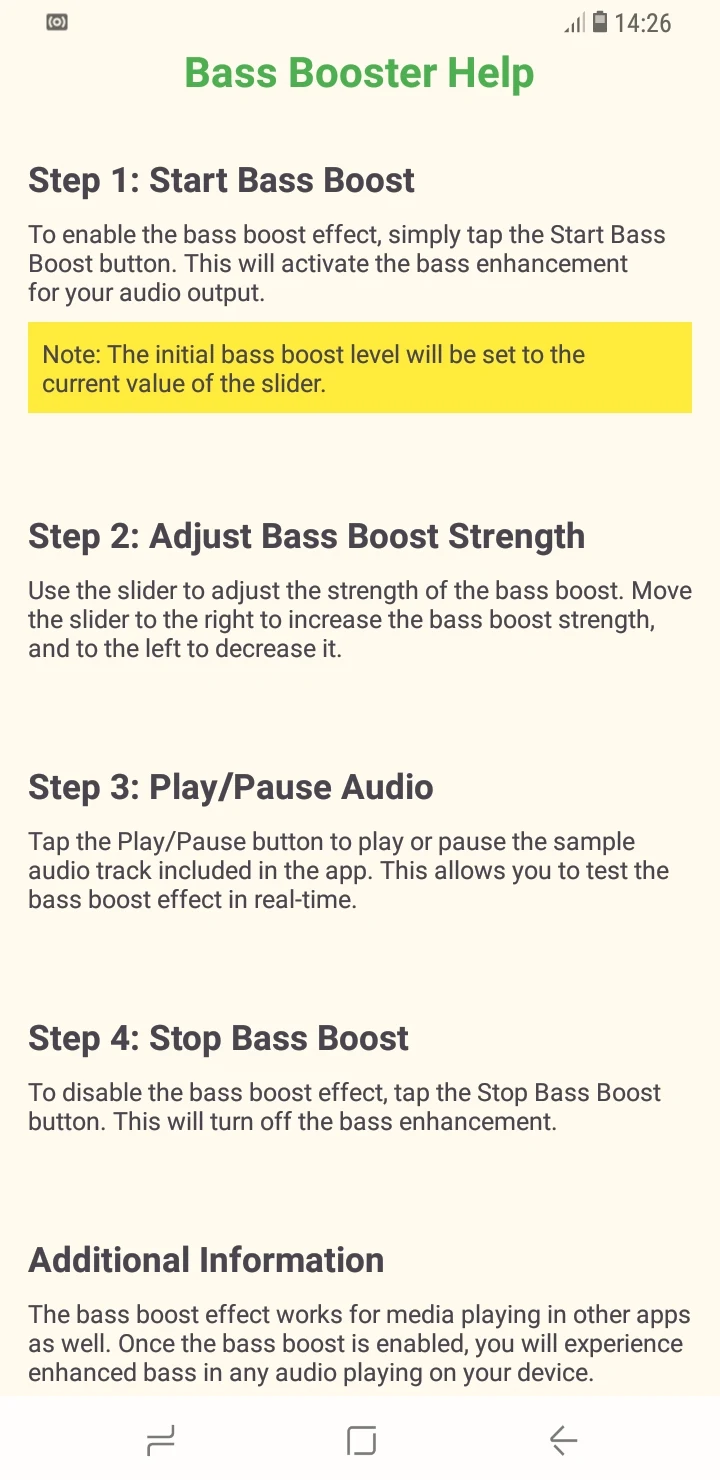 This application is safe for your device; however, prolonged use at high volumes or with bass boost activated could potentially harm your hearing or your device. By downloading this app, users agree that we are not responsible for any damage caused by the use of the app.