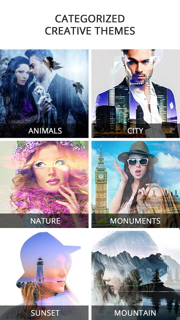 With categorized blend effects ranging from Nature, Sunset, City, Mountain, Monument, to Animal among others, and numerous blend styles along with pre-created effect previews, Photo Blend ensures that your mixed images turn out perfectly every time.
