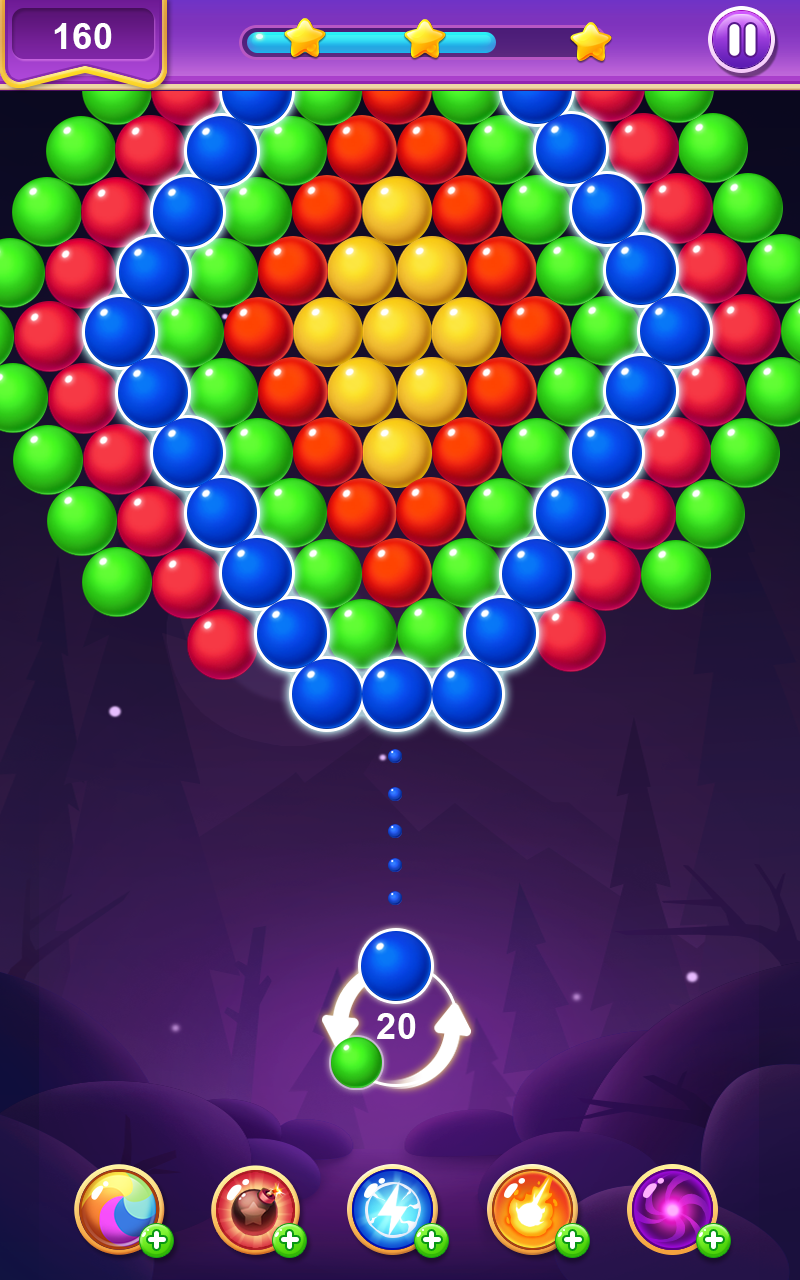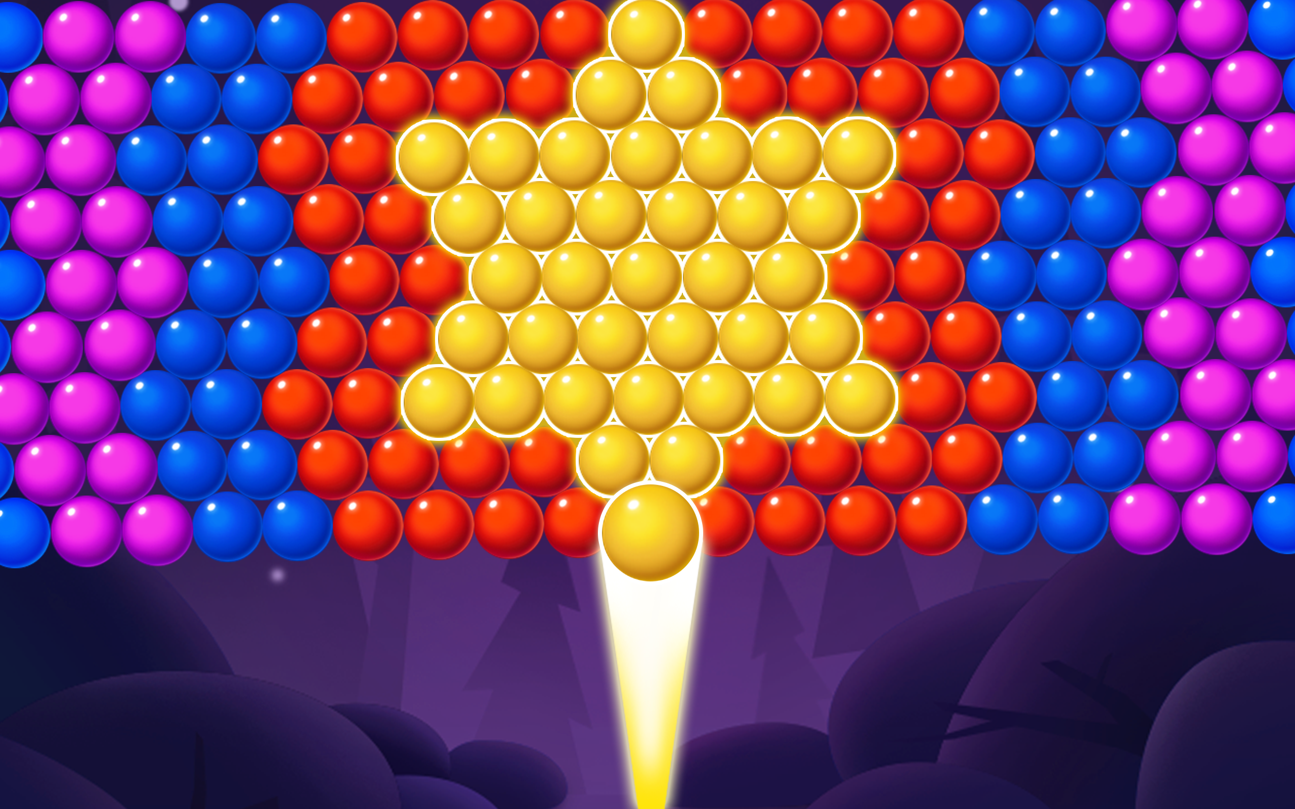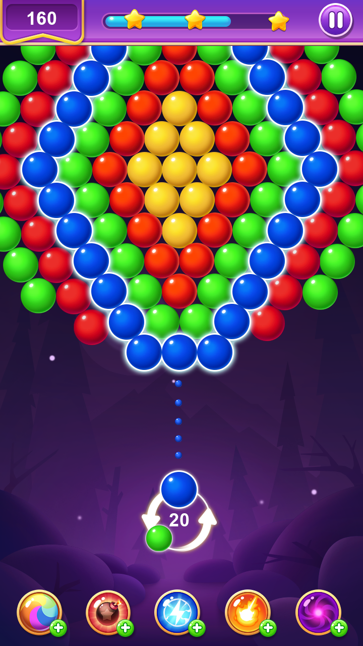 The main goal of Bubble Shooter is to shoot colored bubbles to clear those of the same color from the board and progress through various levels.