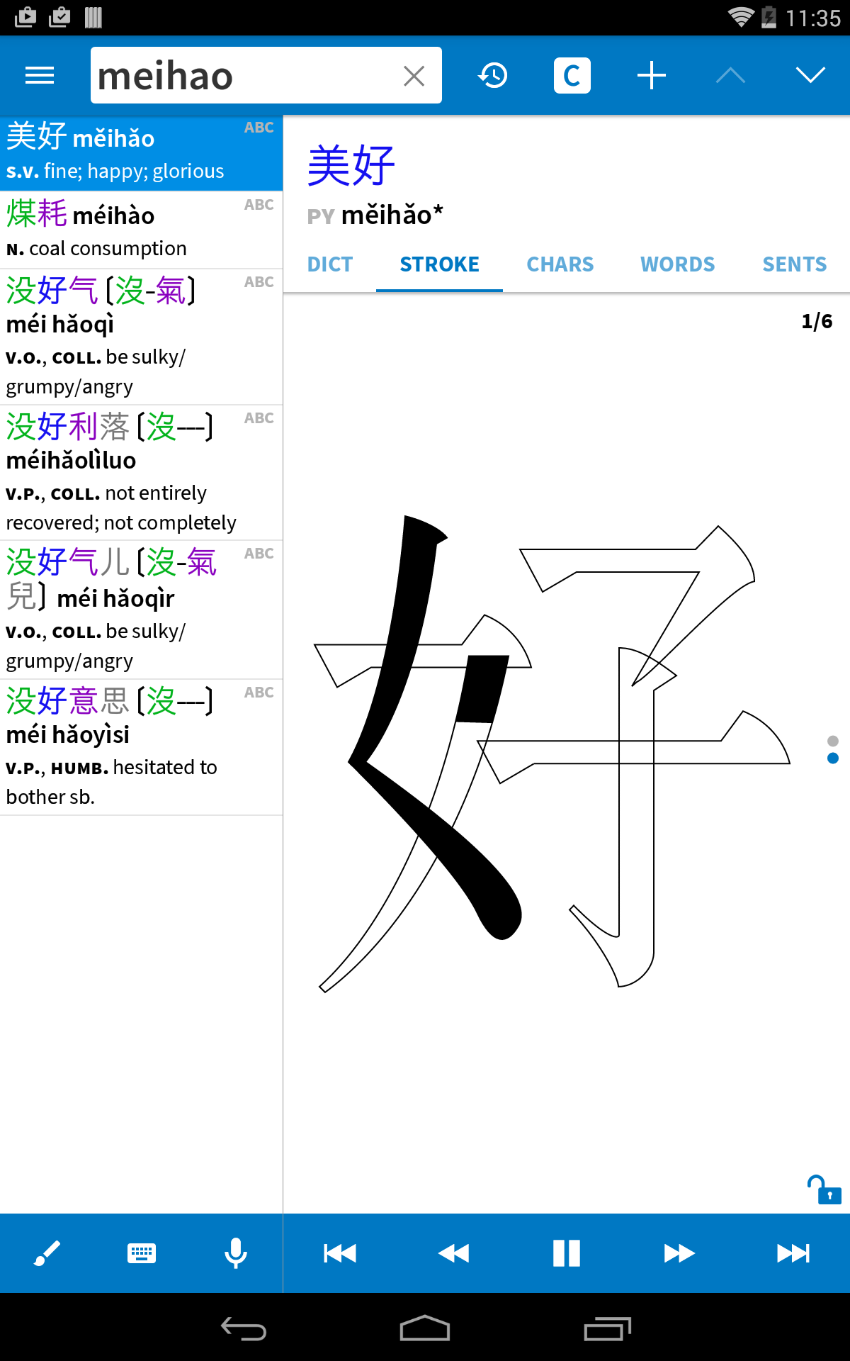 Search for words by Chinese characters, Pinyin (with optional spaces/tones), or a combination thereof. The app supports wildcards and full-text searching.