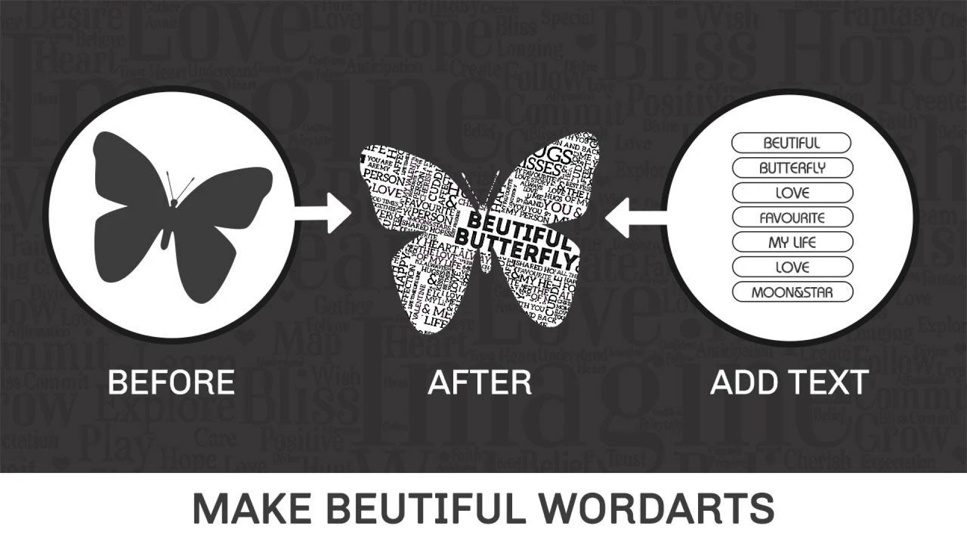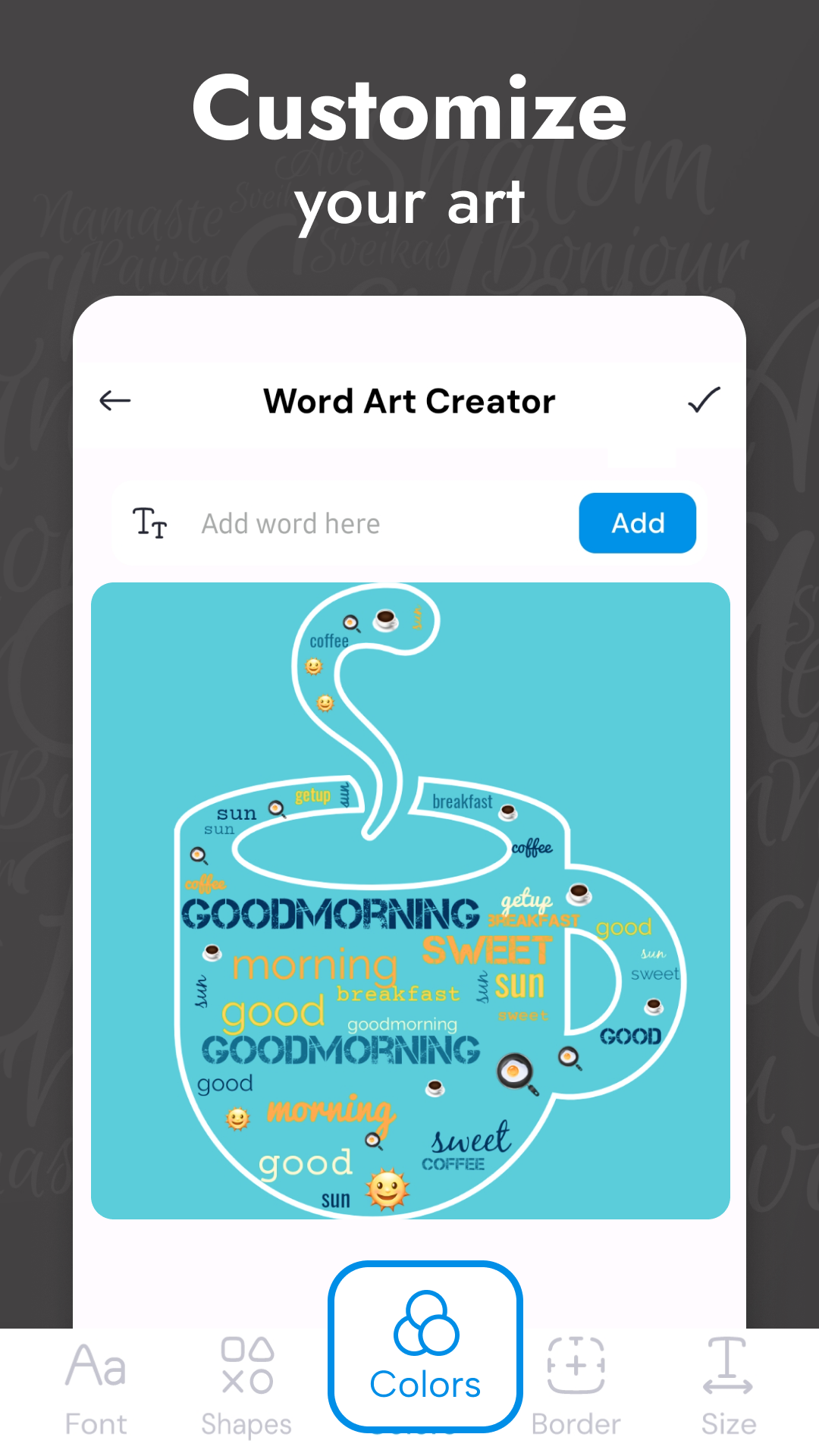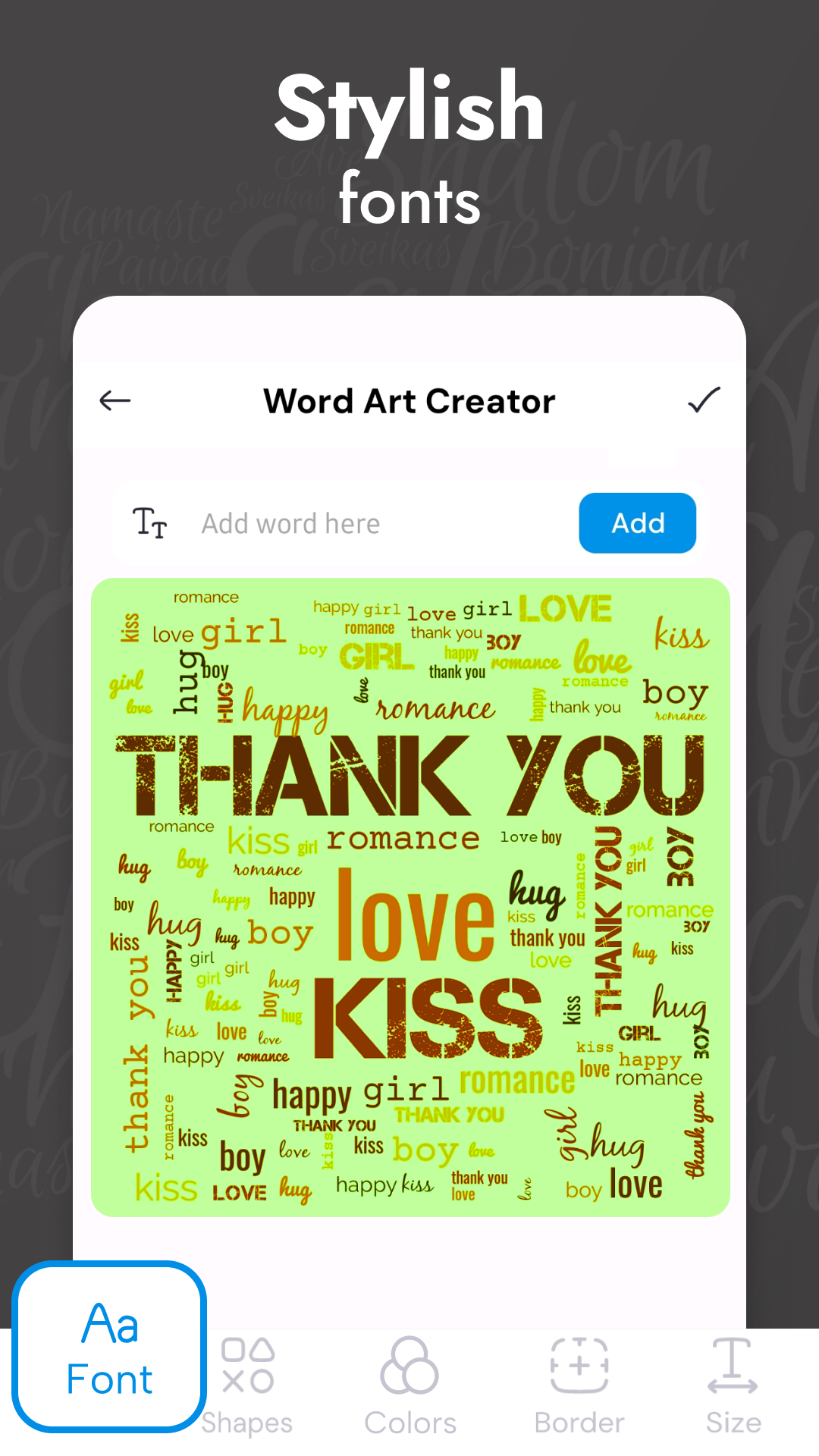 The app efficiently generates a word cloud collage by randomly selecting words, applying colors from your chosen color palette, and arranging them to fit within a specific image or shape. You don’t need to stress about aligning each word with different fonts and colors, as the free word cloud generator is adept at selecting the best combinations for optimal visibility. You'll have access to unique font styles and an extensive range of colors to personalize your word cloud.