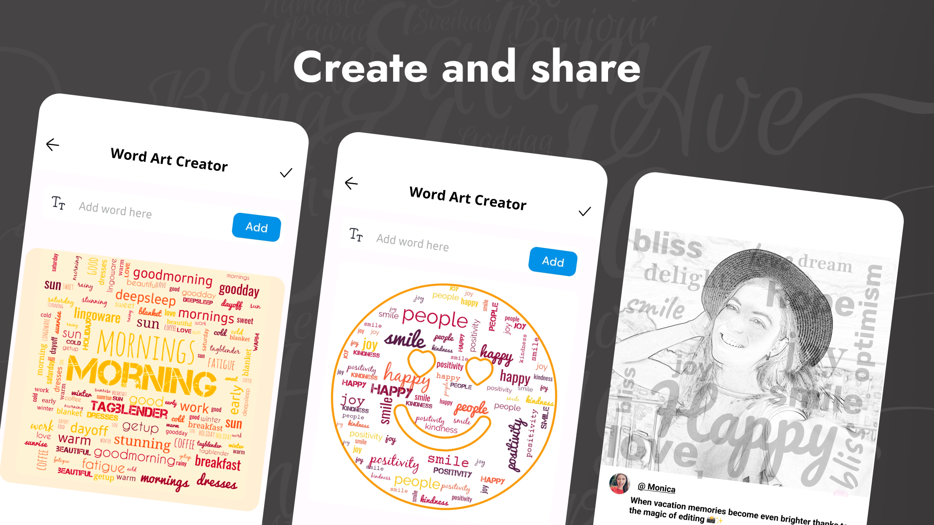 You can easily customize word sizes in your word cloud. If you want to include multiple significant words right at the center, be sure to check out additional options available on the word entry screen. Rearranging the order of words is simple; just drag and drop them as needed. Once you're satisfied with your design, you can export the image. Share your creations directly from the app or post them on social media. The images you create are yours to use however you wish. Simply enter a few words, and the app will shuffle them in an aesthetically pleasing and slightly disorganized manner, making it fun and unique.