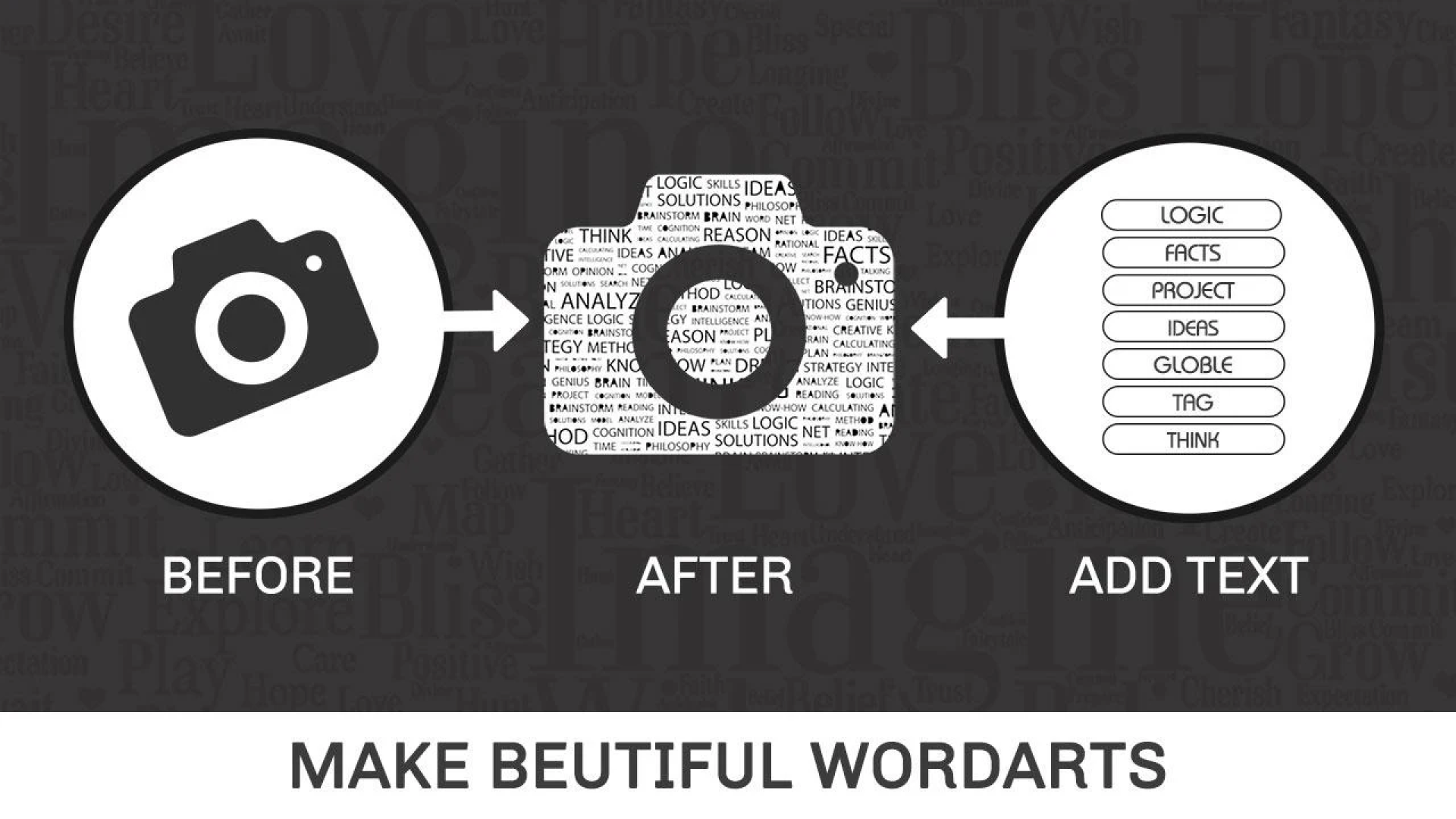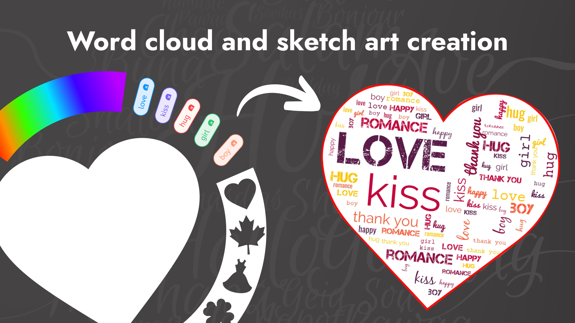 The Word Art Creator Word Cloud Generator is designed to help you create stunning word clouds that showcase your words in various shapes. This app features a dedicated store for shapes, offering a wide array of categories. It is highly customizable, allowing you to choose different fonts, colors, and layouts for your words.
