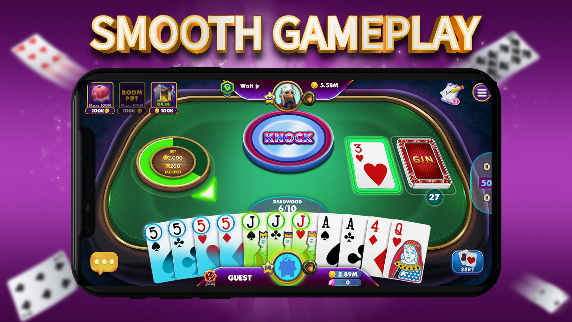In Gin Rummy, you'll encounter real challenges by battling against other actual players. Feel the genuine gaming atmosphere, interact with users in the room, and display your strategies and skills as you fight for victory.