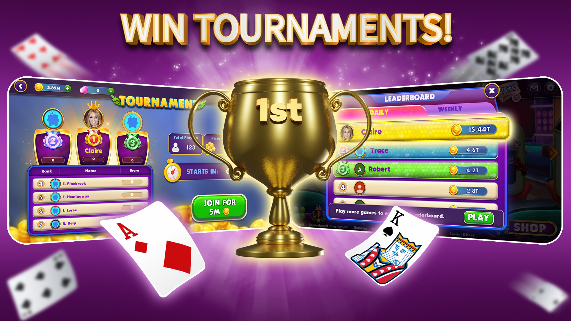If you're a true Gin Rummy expert, substantial rewards are waiting for you! Participate in the scoring system to earn high points and climb to the top of the leaderboard. Showcase your card skills and compete with other top players to become a star player.