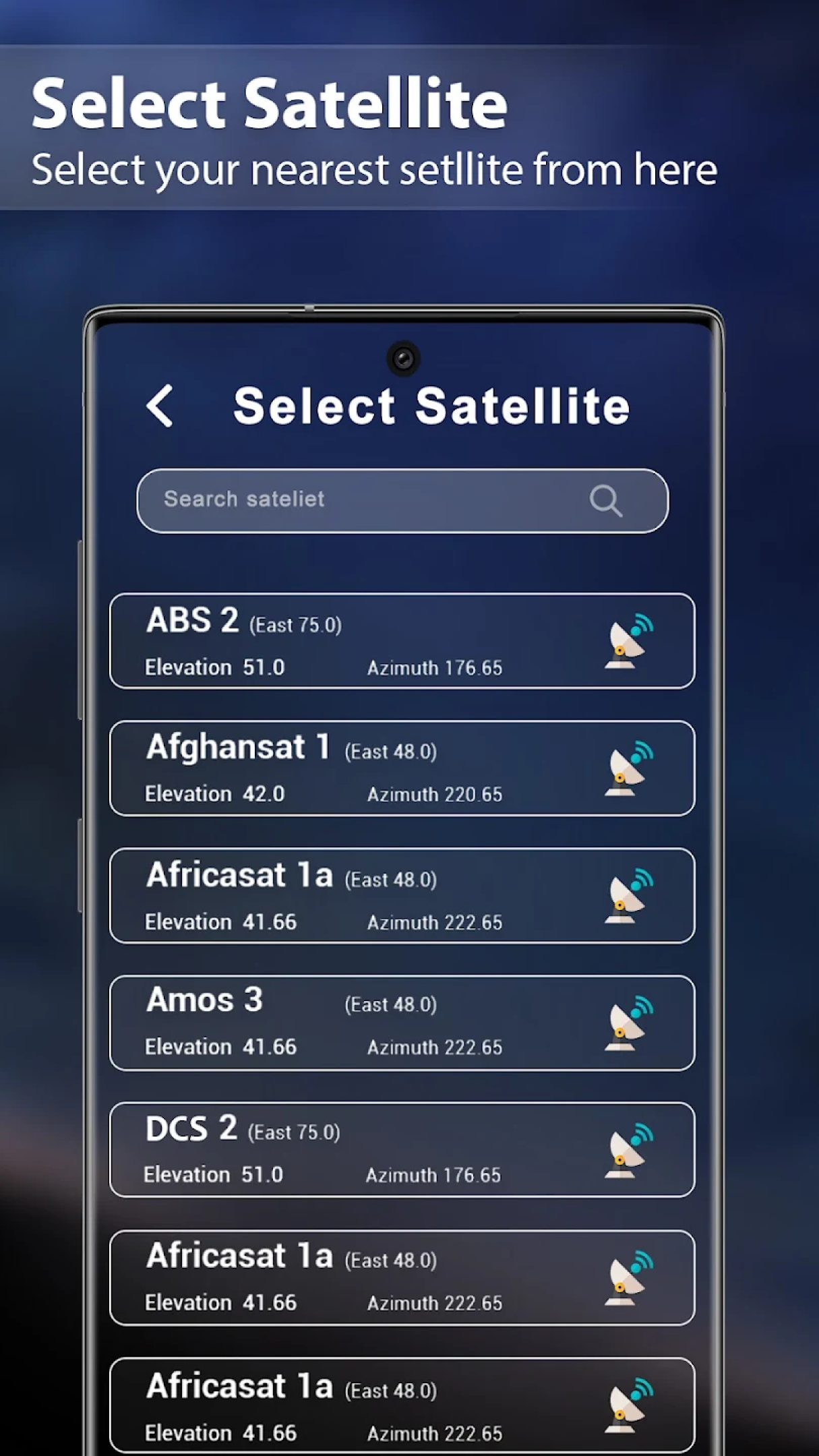 Displays live satellites visible in the Satfinder interface.