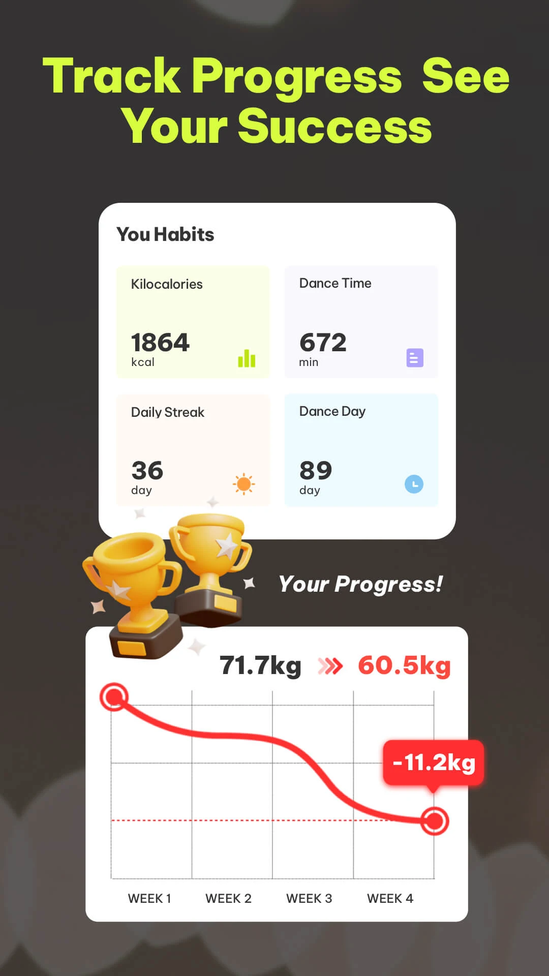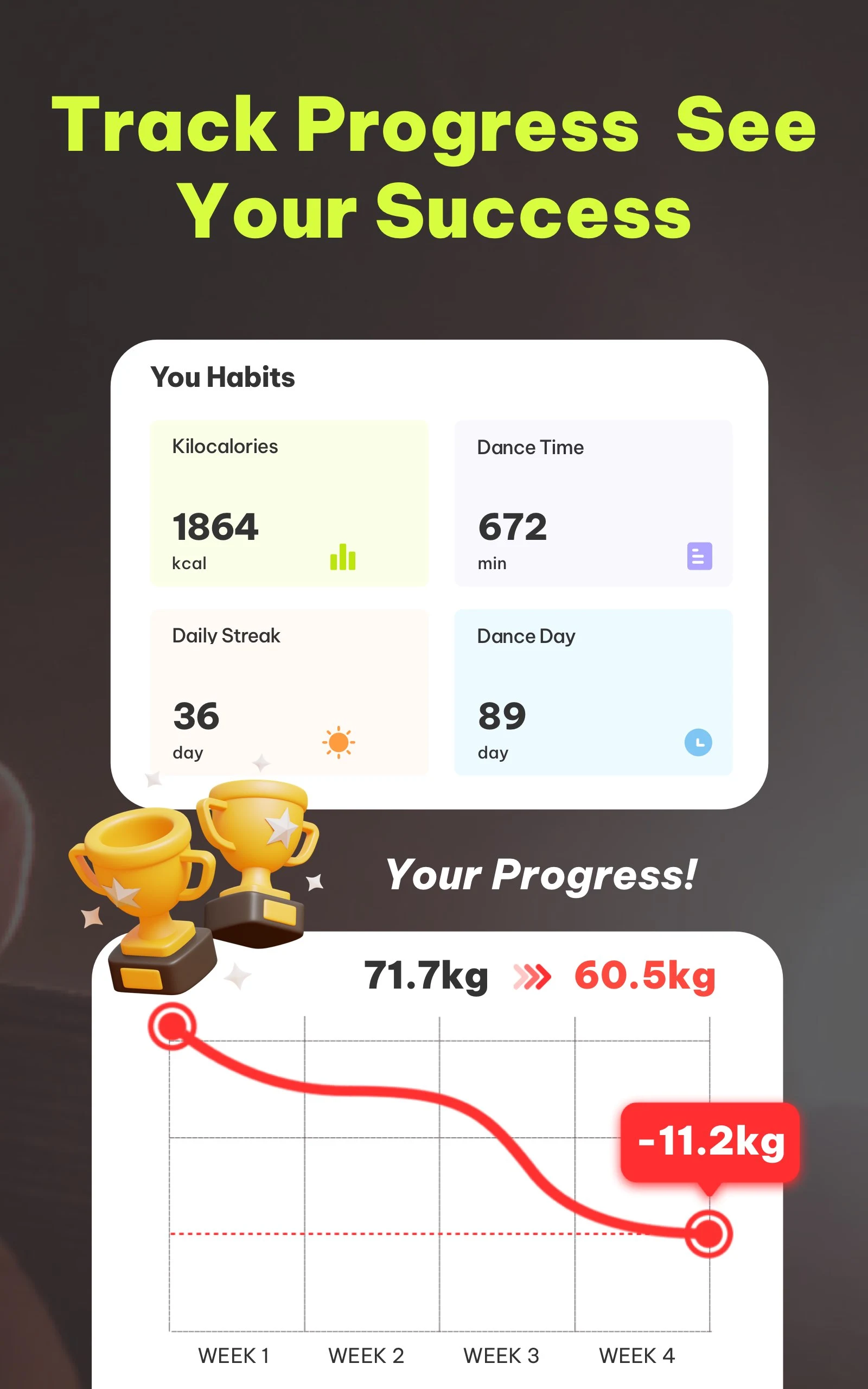 Stay motivated by tracking your progress! With DanceFitme, you can monitor calories burned and practice data to help you reach new fitness levels. Keeping fit has never been easier – watch your progress and move closer to that dream body!