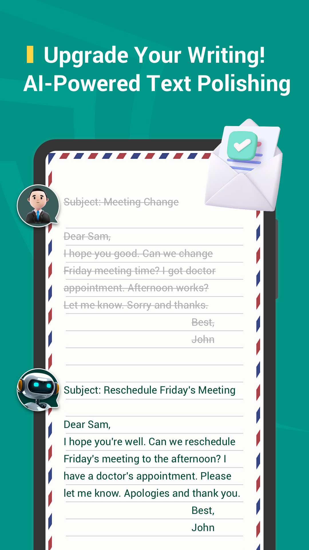 Communicate like a native with our AI-powered translator. Improve your writing with our text polishing feature, which eliminates spelling and grammatical errors while enhancing clarity and impact. Additionally, save valuable time as the AI Assistant efficiently summarizes your lengthy texts, making your messages concise and comprehensible.