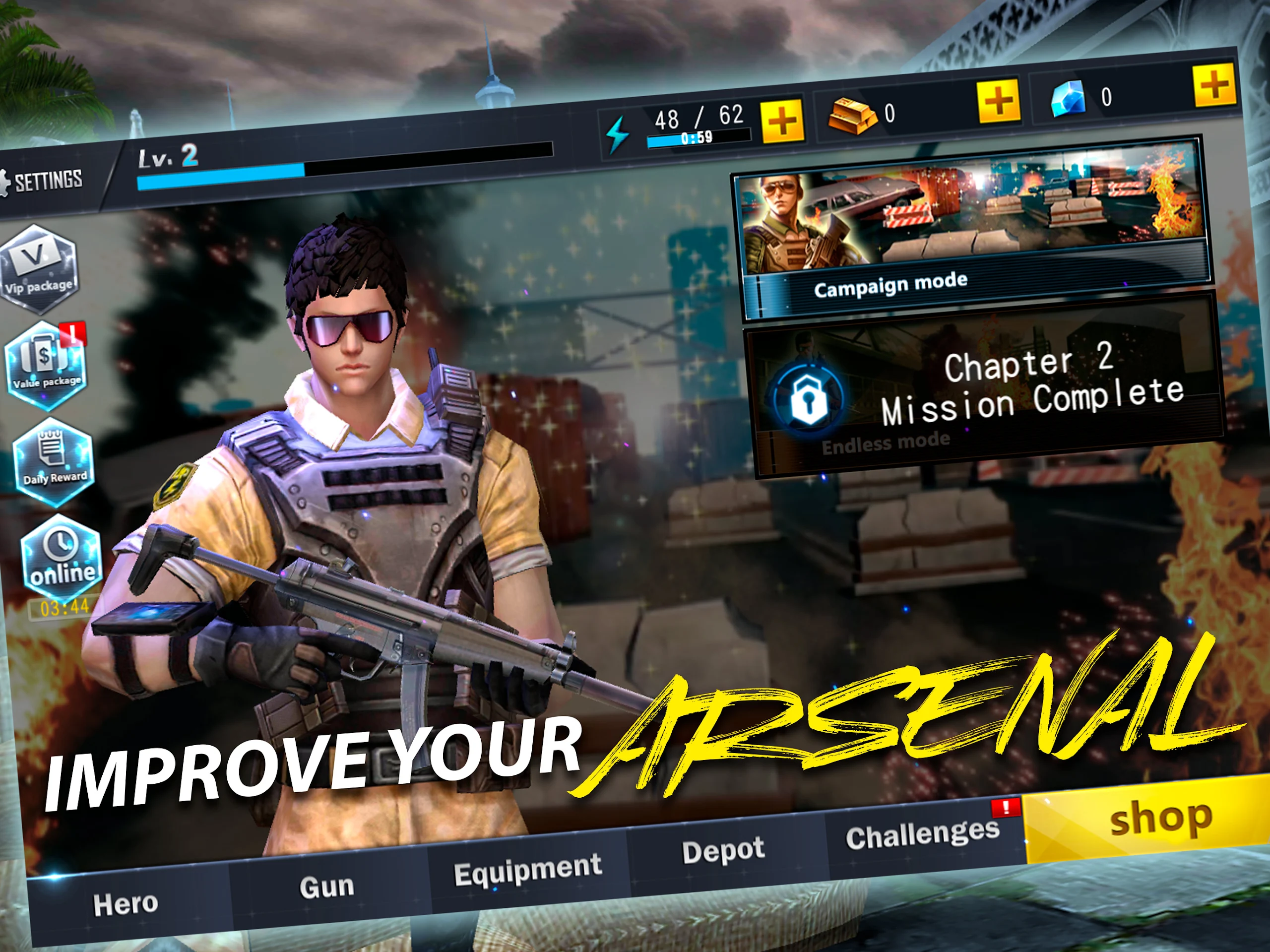 Unlock more powerful firearms, including sniper rifles, assault rifles, crossbows, and bazookas.