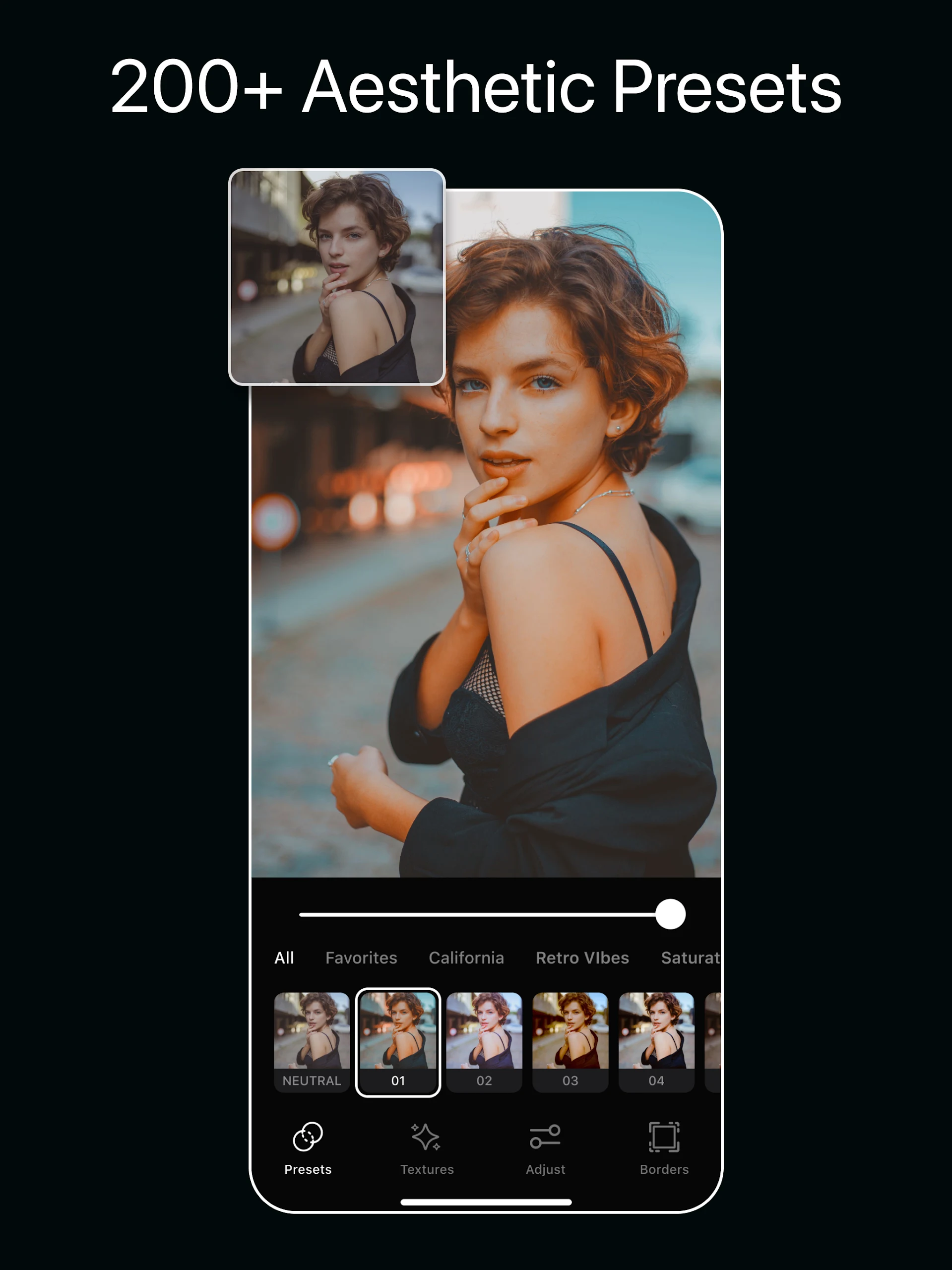 Delve into our expansive collection of over 300 artistic filters. Categories include B&W, vintage, summery, and moody. With just one tap, transform your photos into magazine-worthy aesthetics that inspire you to discover your unique style.