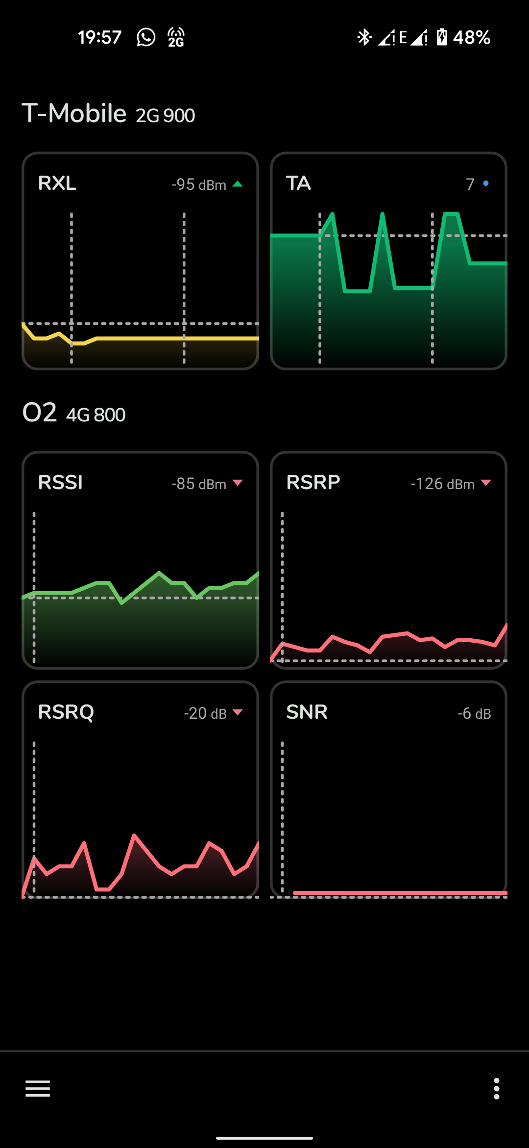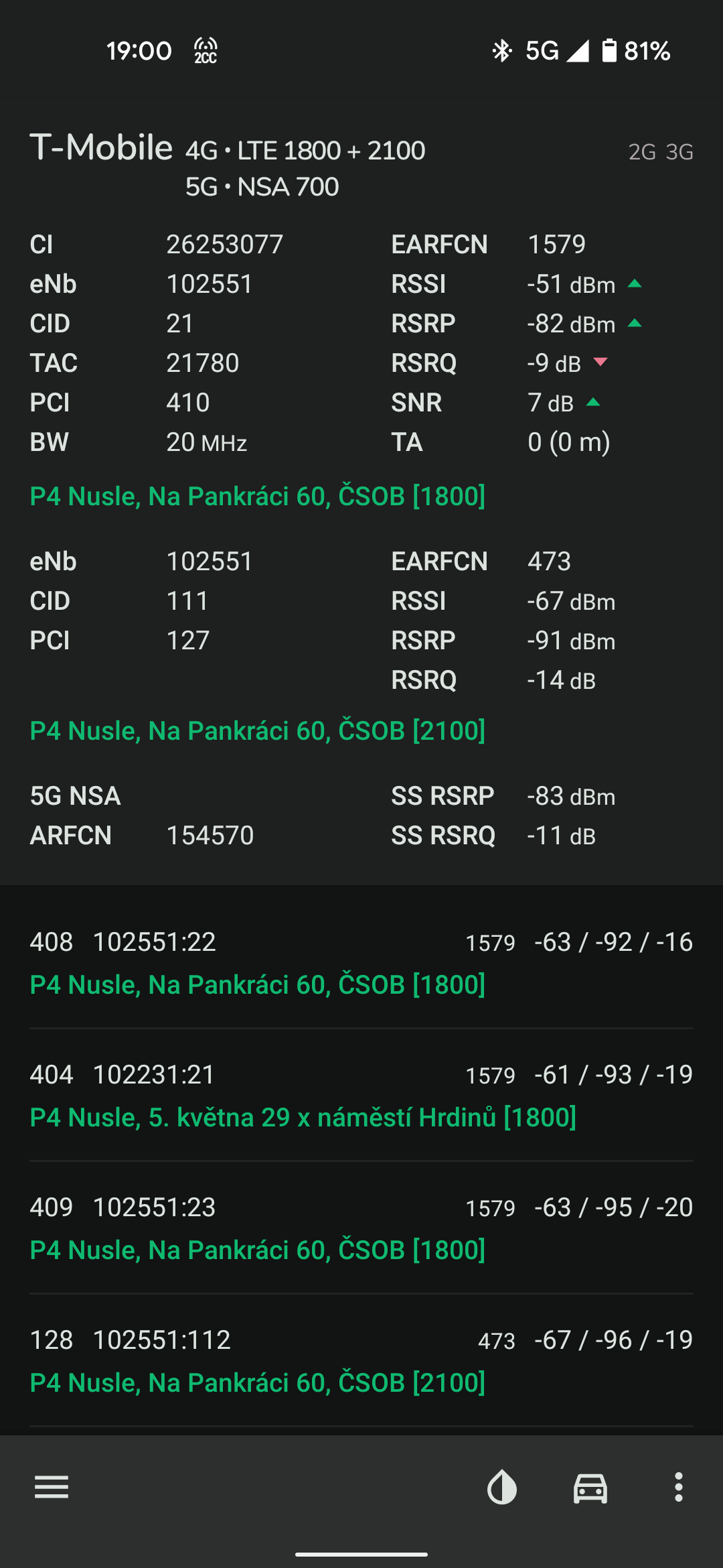 The app supports various network types, including GSM, CDMA, WCDMA, TD-SCDMA, 4G LTE, 5G NSA, and 5G SA. For LTE networks, NetMonster detects aggregated carriers (known as LTE-Advanced). In areas with 5G NSA, users can determine if it is currently in use or merely deployed, along with insights into carrier aggregation involving both 4G and 5G NSA.