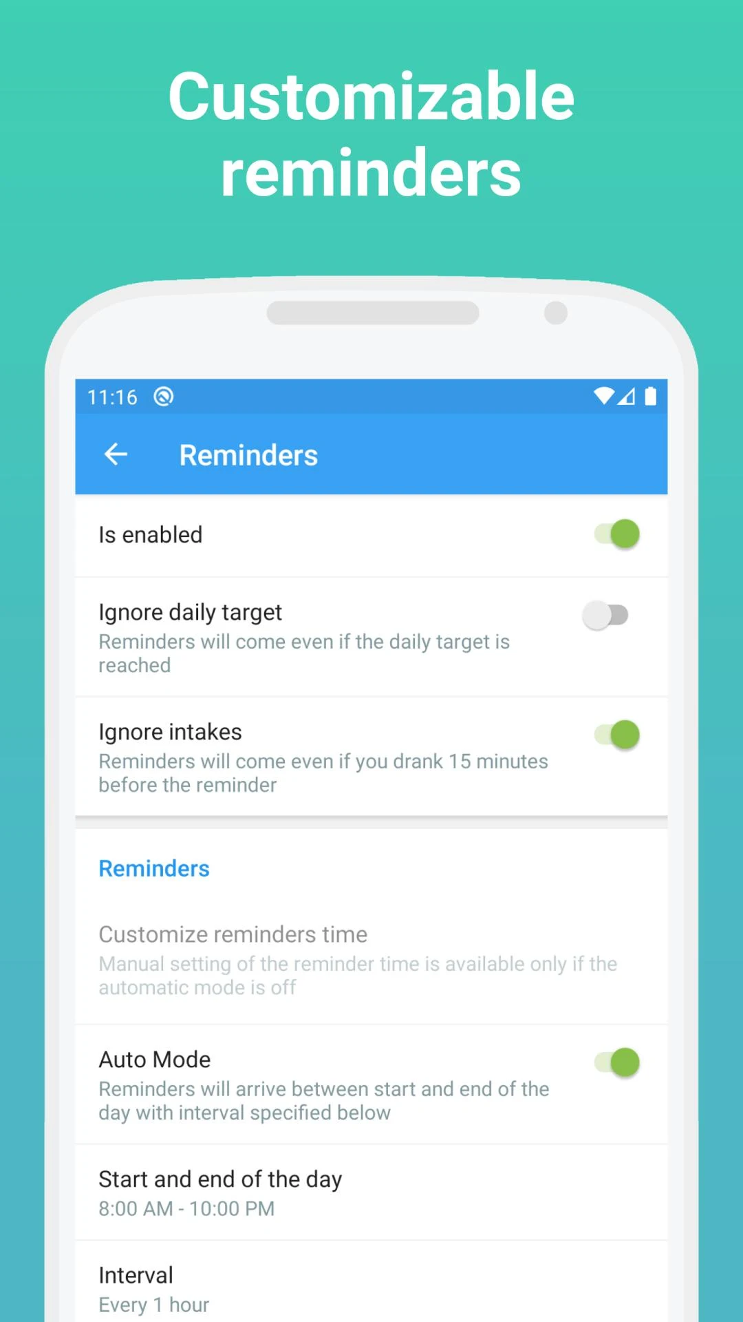 Just like setting an alarm, you can create automatic or manual reminders within the app. This feature ensures that you never miss an opportunity to drink enough water throughout the day.