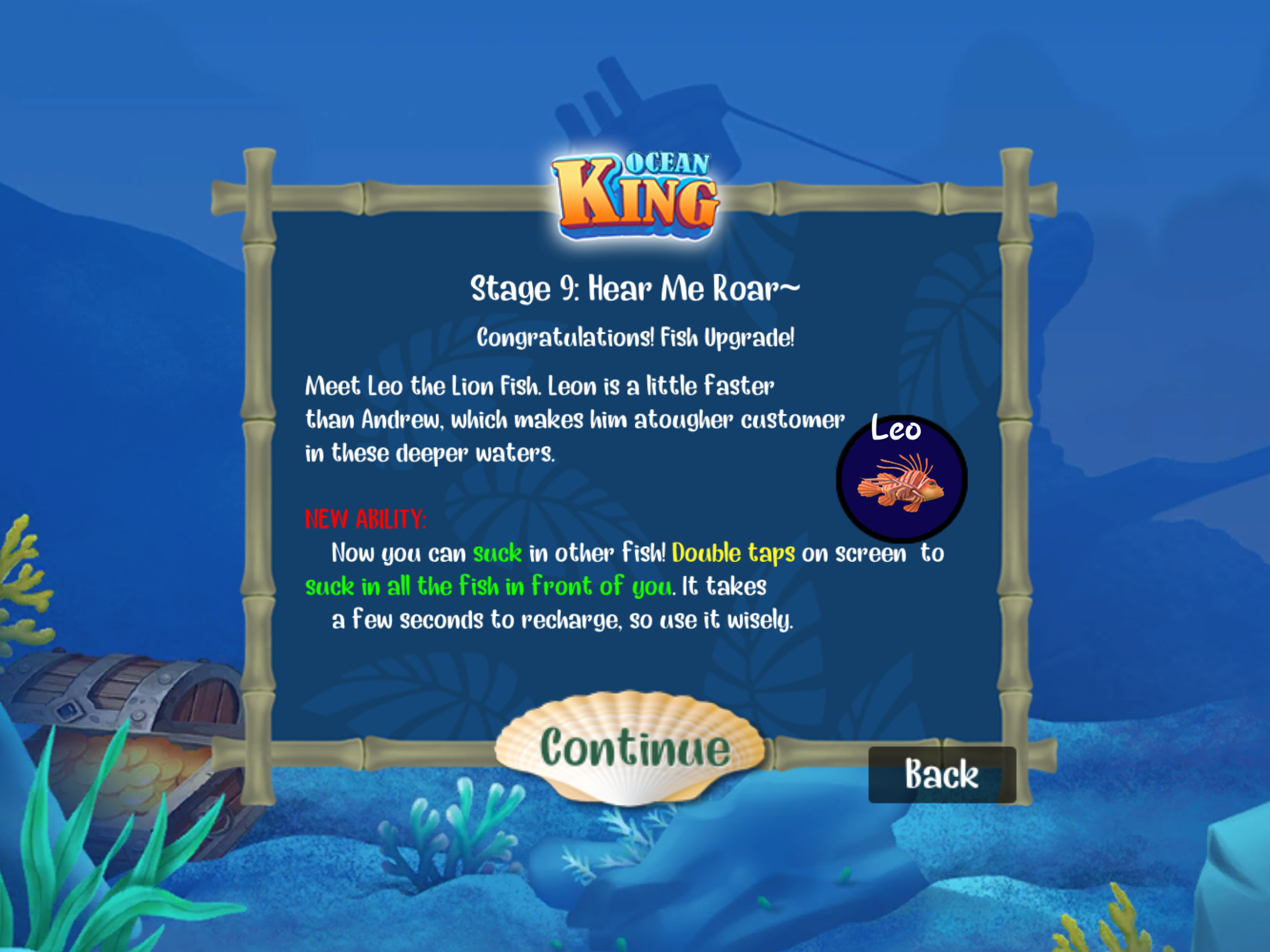 At the end of each level, your fish will be large enough to consume almost everything on-screen. However, stay vigilant! Hazards include depth charges, larger predators, naval mines, radiation-poisoned fish, and jellyfish.