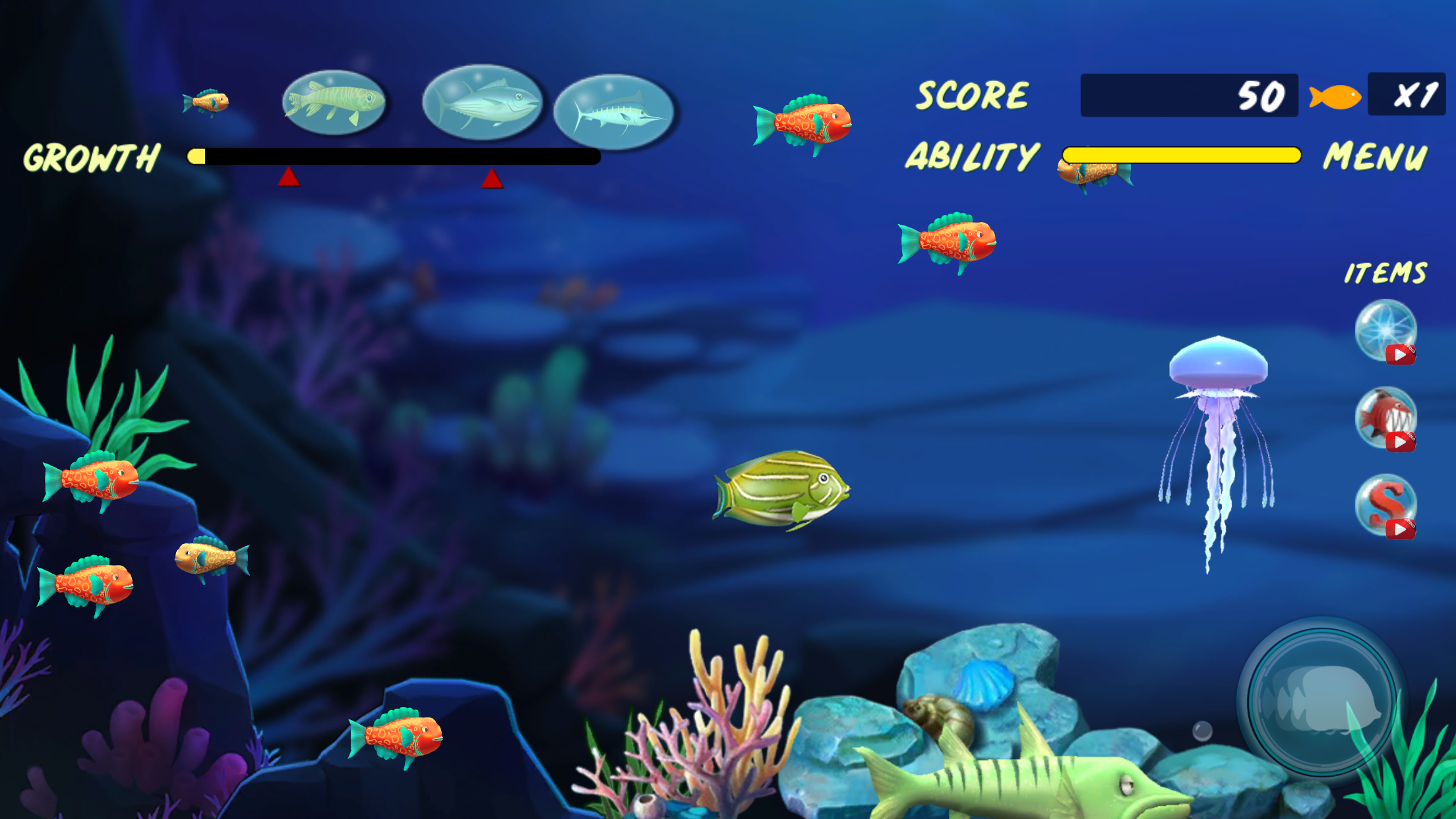 As you consume smaller fish, your character grows, allowing you to eat progressively larger fish.