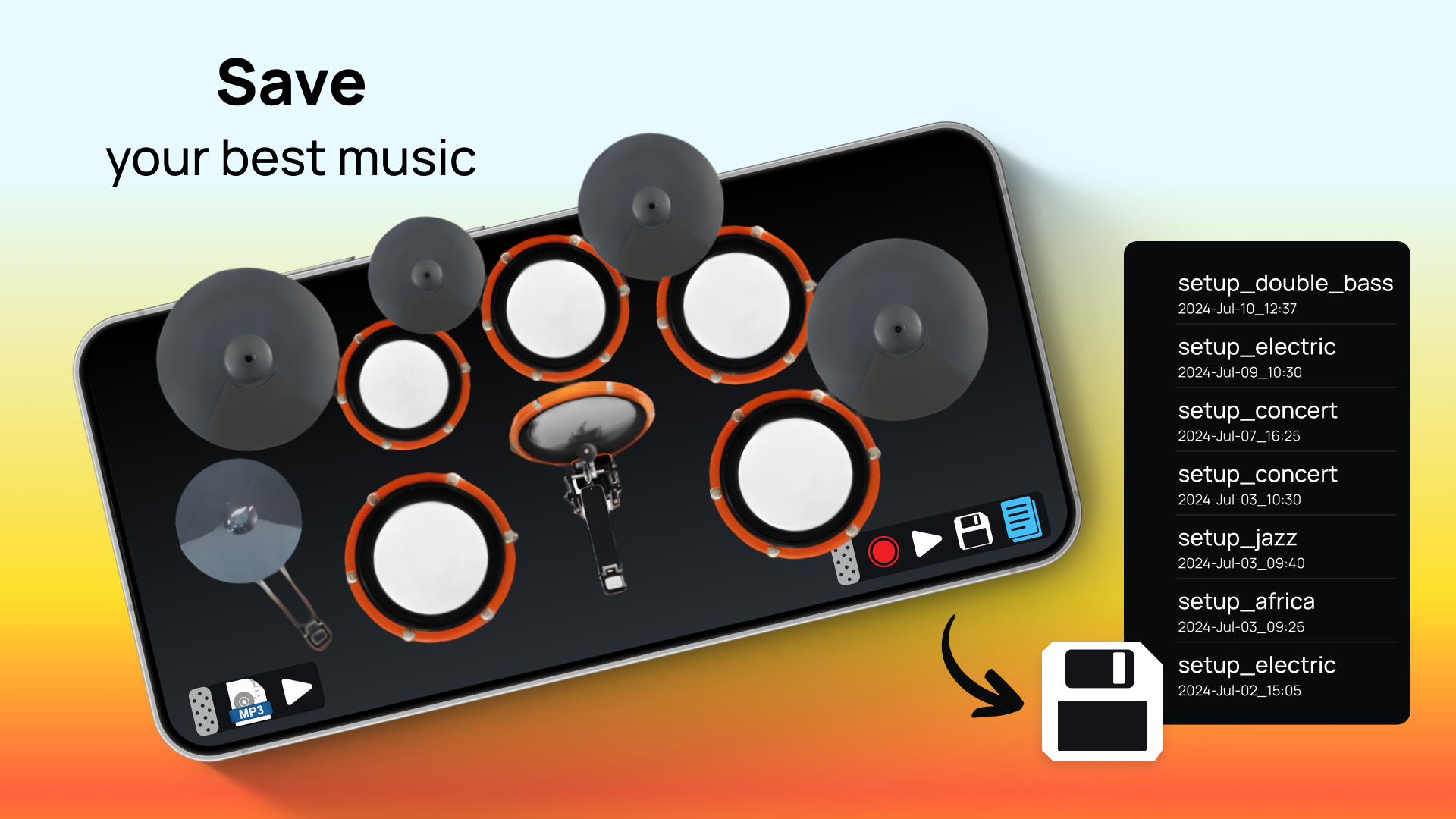 Capture your creativity by recording music (beats) for each setup separately. Share your recordings with friends or across multiple devices to showcase your drumming skills.
