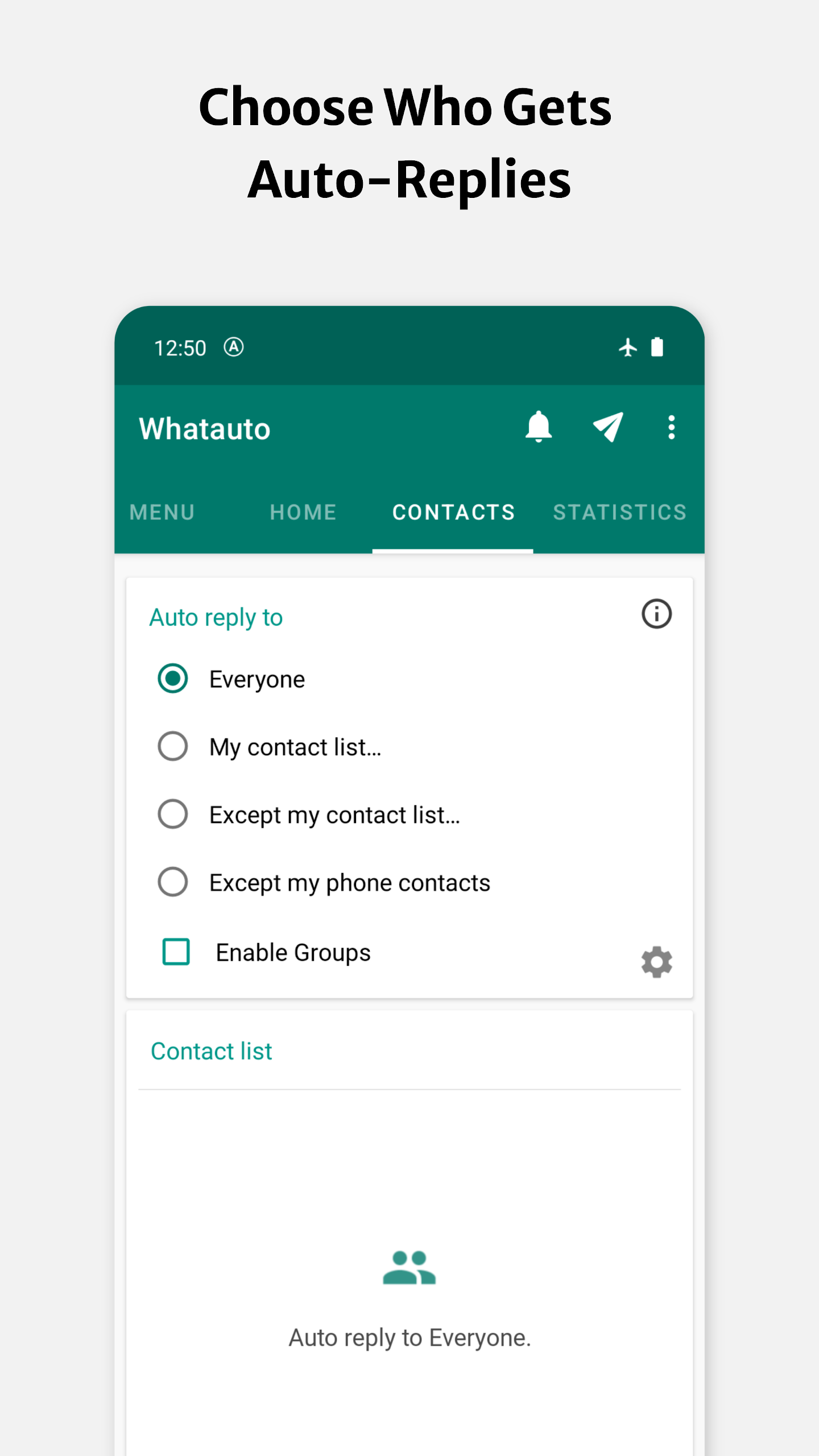 WhatsAuto supports sending auto-replies not only to individual contacts but also to groups within your messaging apps.