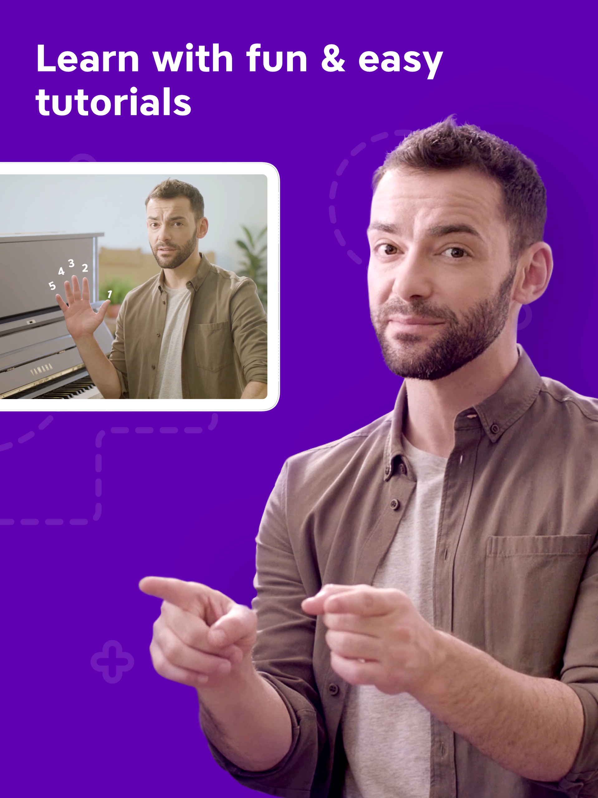 As you advance, you'll learn to play with both hands, master chords, and much more. Your personal instructor will introduce theory topics through engaging animations and walk-through videos. Additionally, you’ll participate in fun games designed to enhance your musical hearing, hand coordination, rhythm, and other essential skills.