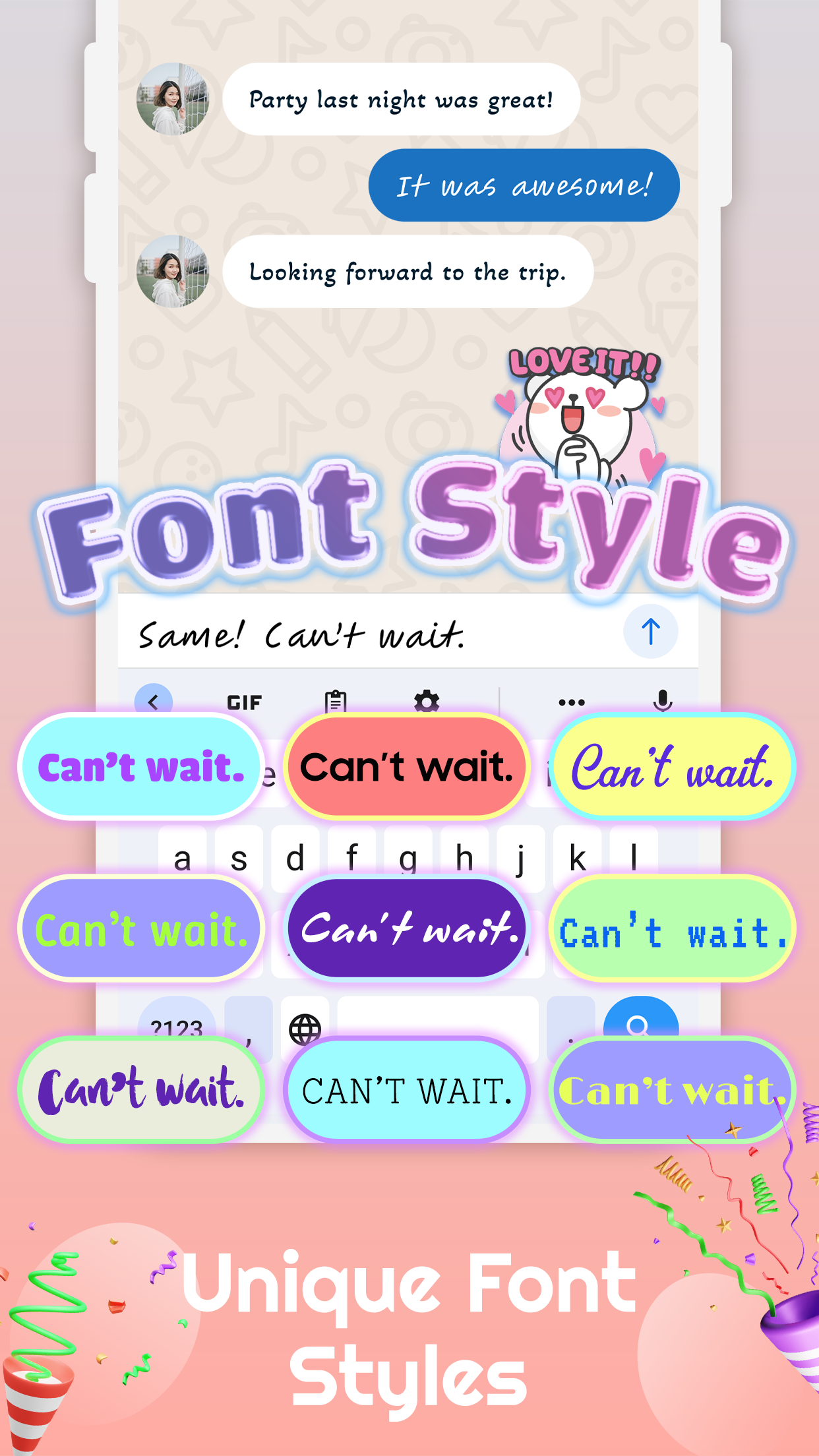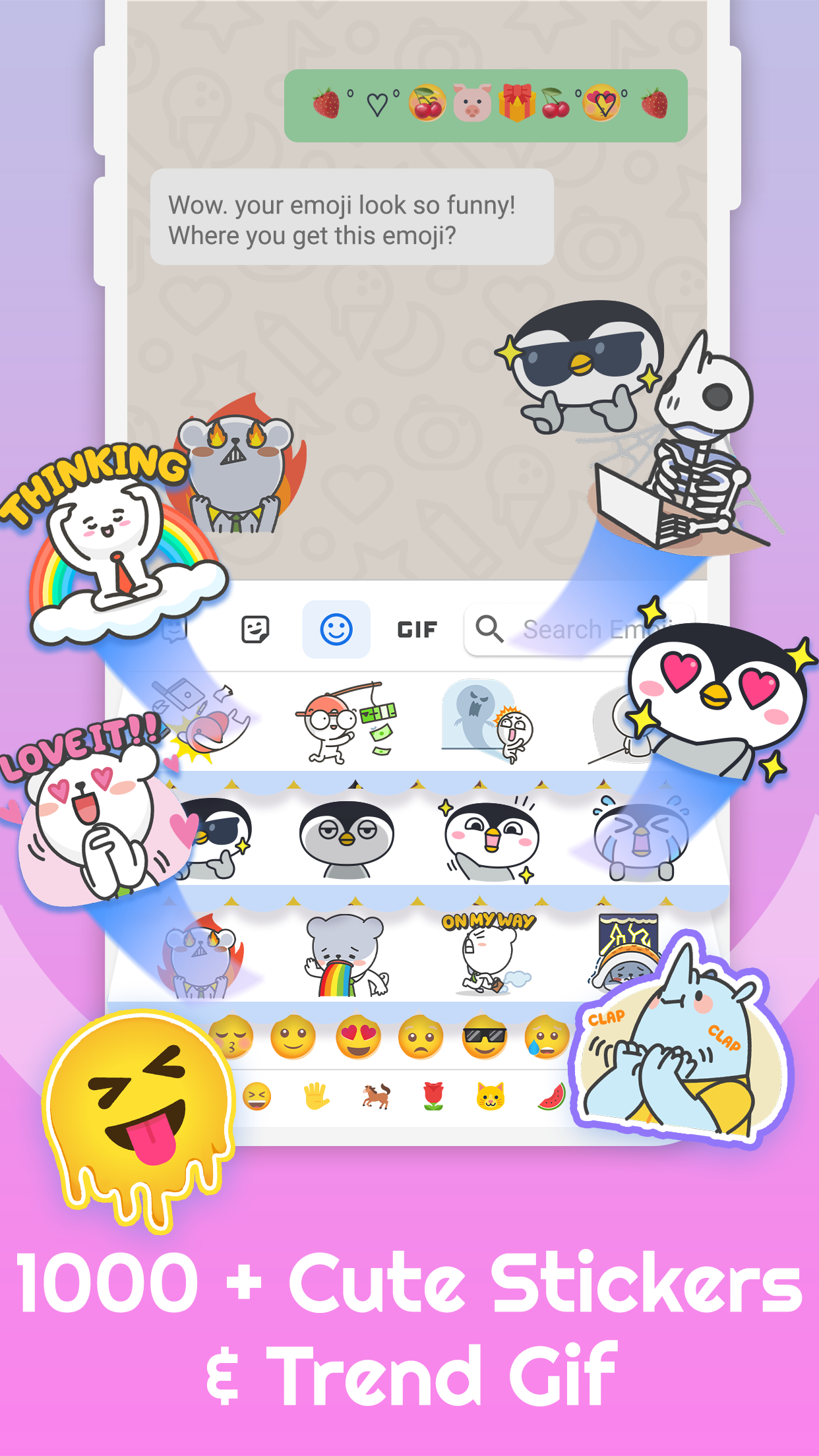 Access over 3000 emojis, stickers, kaomojis, cute emoticons, GIFs, cool fonts, and stylish themes for enhanced typing fun and accuracy.