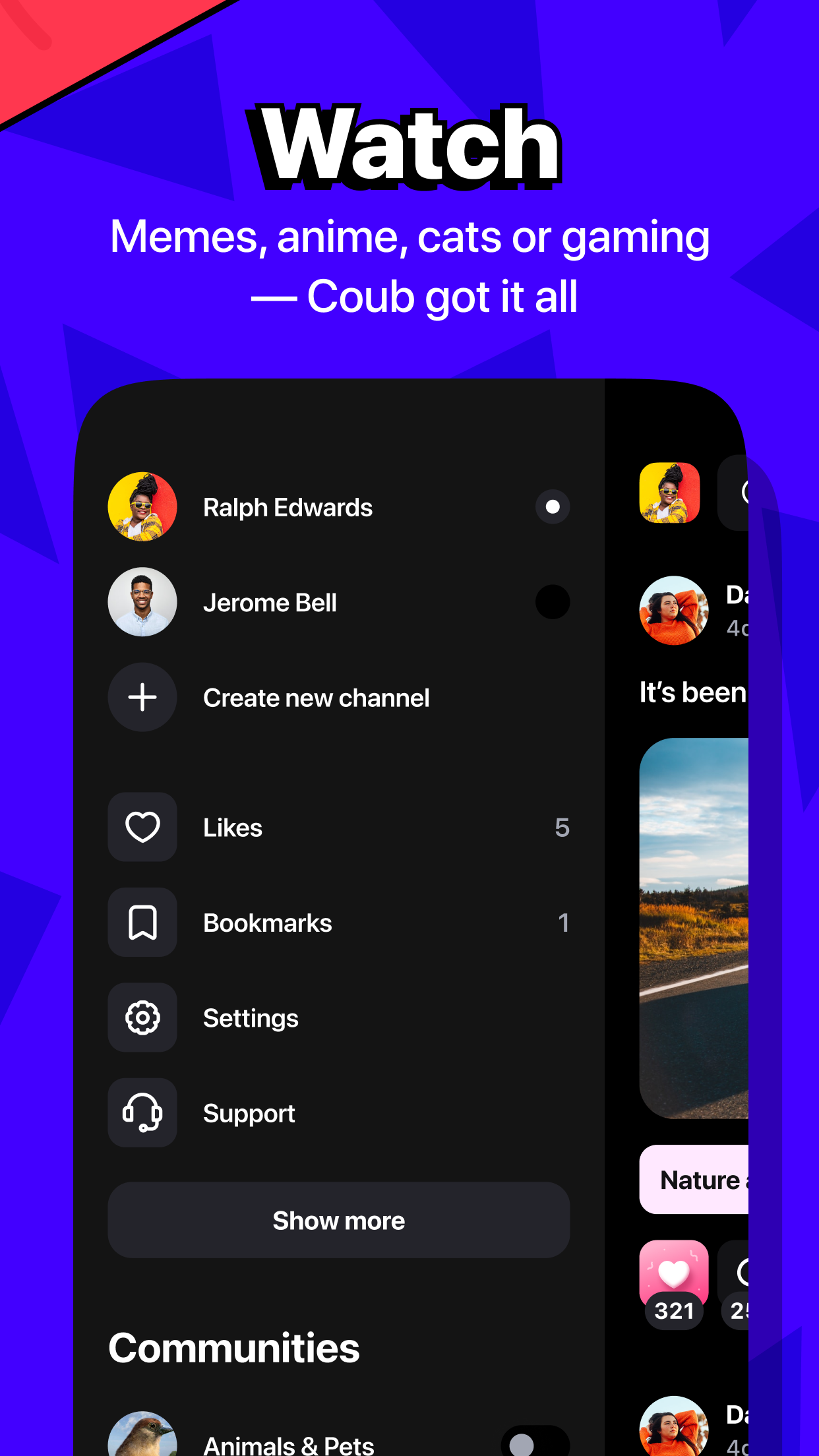 Explore themed channels to discover the best coubs related to movies, TV shows, series, anime, or even quirky cat videos. If you can't find a channel that fits your interest, feel free to create one yourself!