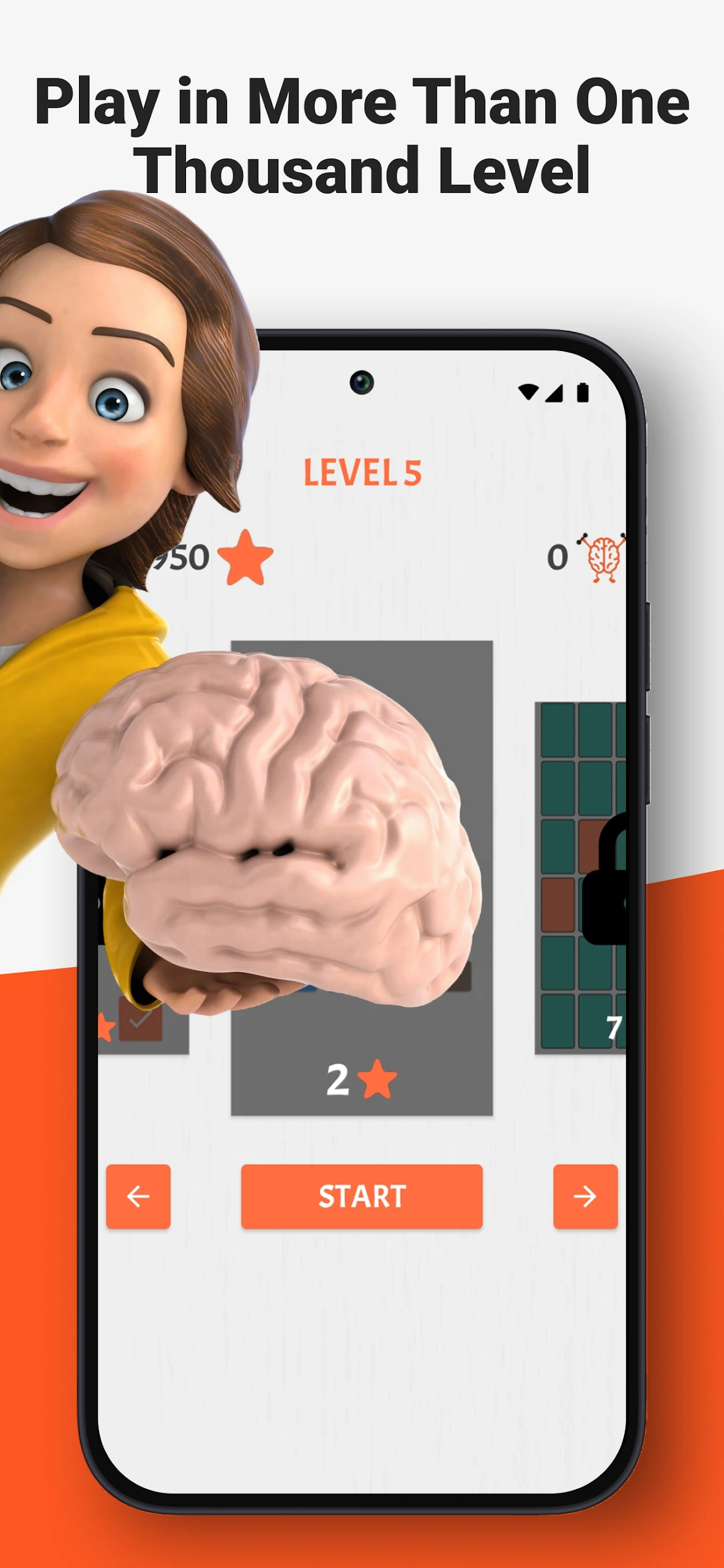 Each level pushes your skills to the limit. After completing a level, you'll receive a ranking from 1 to 5 Stars based on your performance, rewarding you with “Brains.” Collecting stars enables you to earn more brains, which can be used to retry a round, complete a round, or pass a level at five stars.
