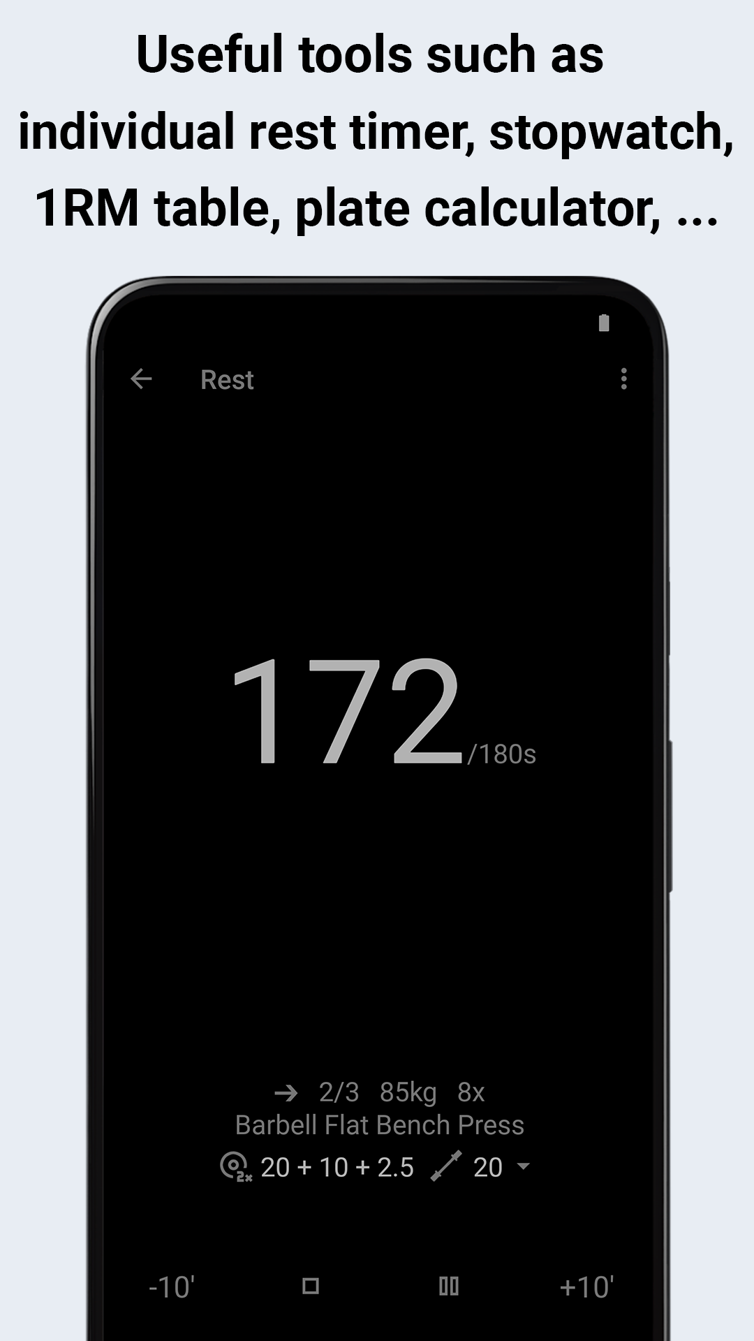 Thanks to its built-in stopwatch and countdown timer, you can utilize the GymRun app in multiple ways. The custom plate calculator facilitates the counting of your workout and resting times, while also providing options to customize how the app displays your workout data. This ensures you receive the most optimal views of your GymRun Workout Log results.