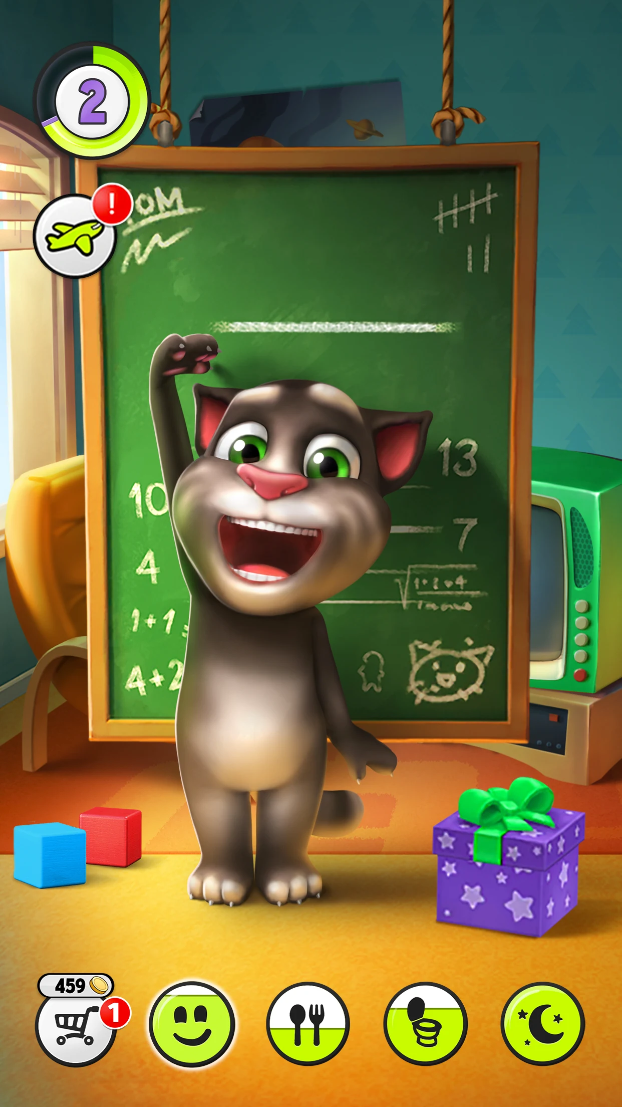 In order for Tom to fall asleep, he needs to meet all of his hygiene, play, and eating requirements. Once these are fulfilled, a red star and page icon will appear on the screen. Click the icon to put your cat to sleep, and don’t forget to turn off the lights to complete this task. When the cat icon turns green, you can resume gameplay. By finishing levels 1 and 2 with all green symbols, you can continue to advance and increase your star rank. Other symbols include a shopping basket and icons mentioned previously.