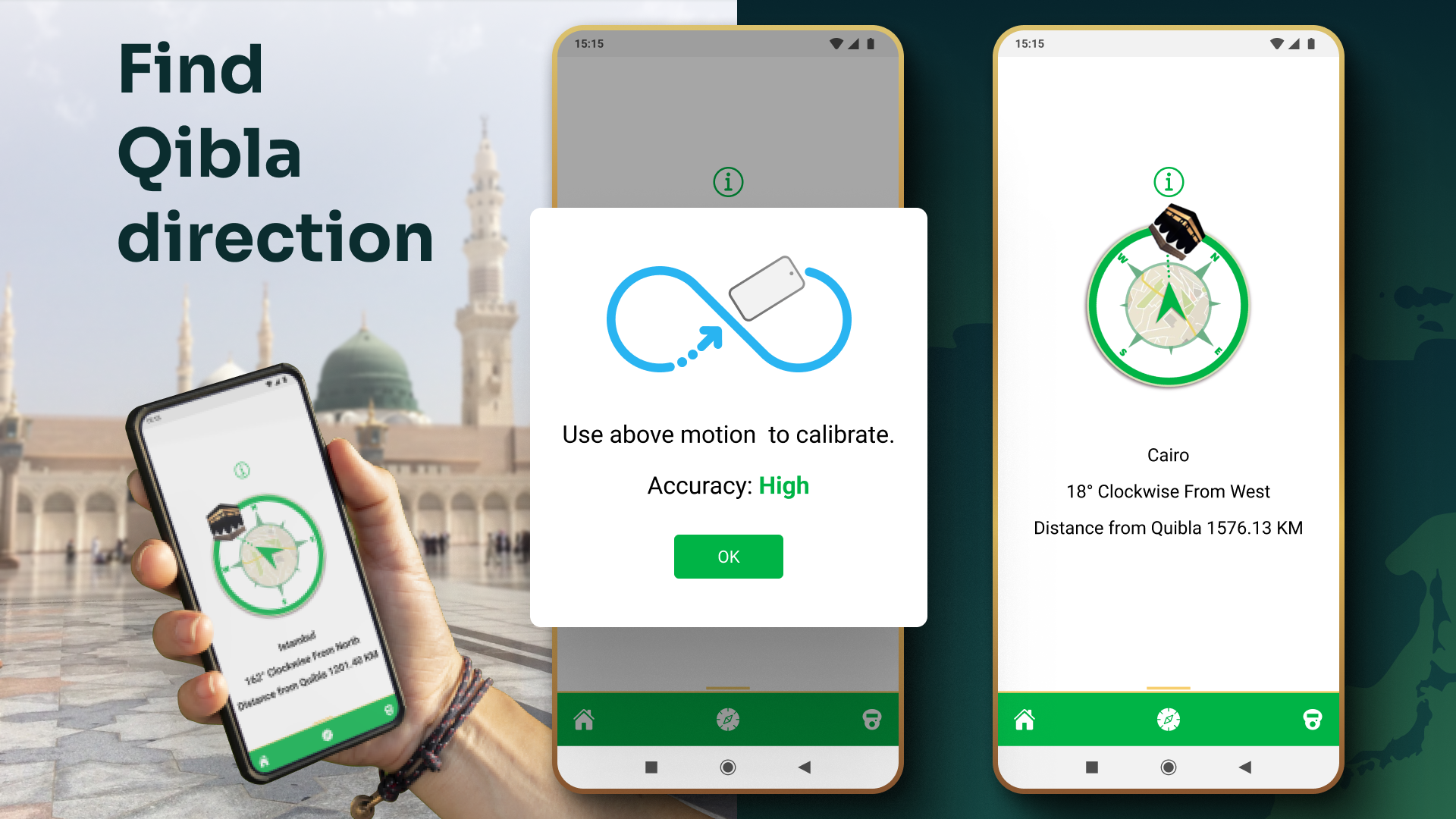 The Qibla Finder allows you to quickly locate the Qibla using your Android smartphone. Simply open the app, lay your phone on a flat surface, and in just seconds, it will show you the precise direction towards the Kaaba.