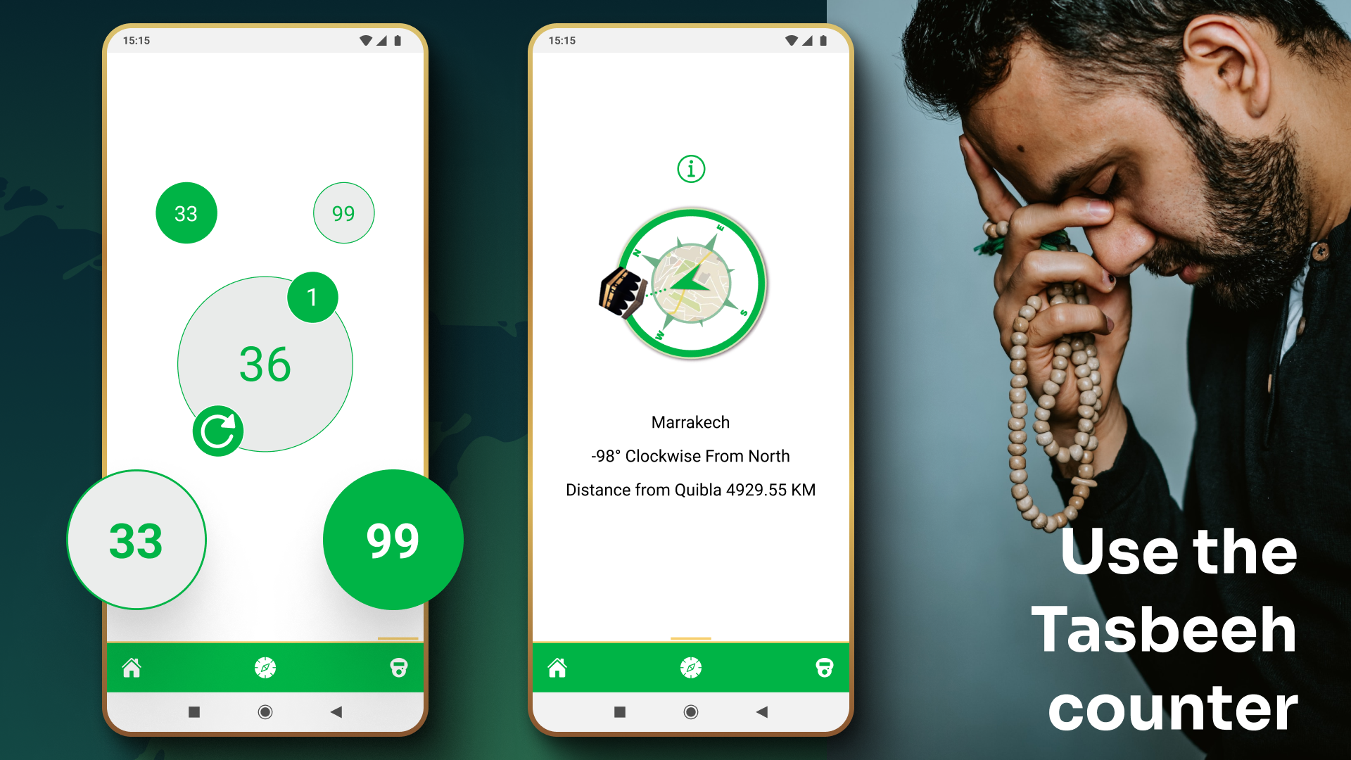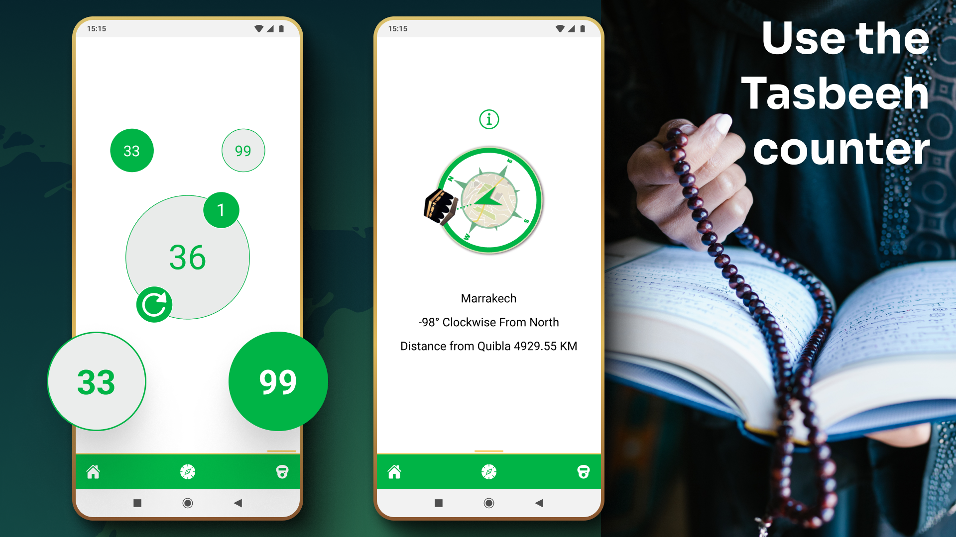 This combination of a tasbeeh counter and Qibla compass enhances your overall prayer experience, providing everything you need in one seamless tool.