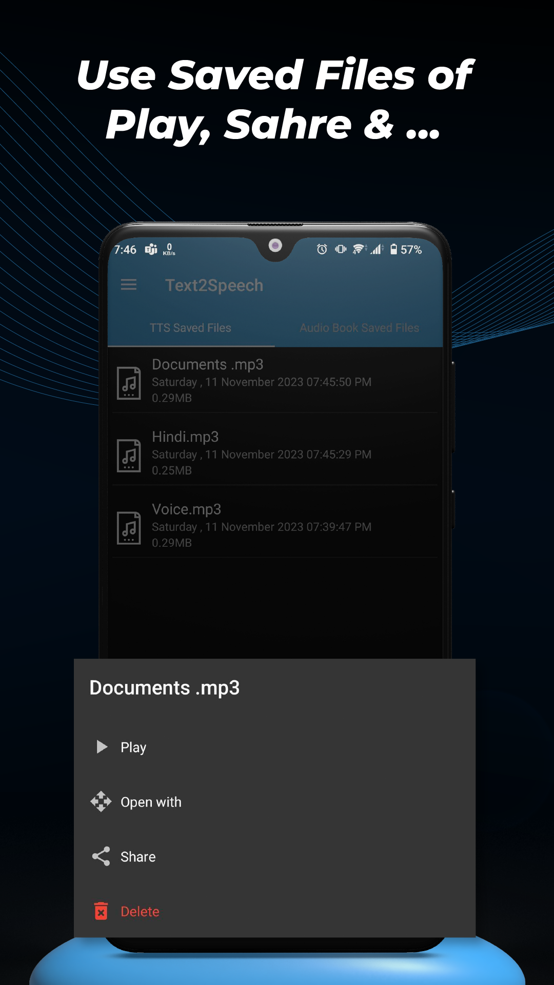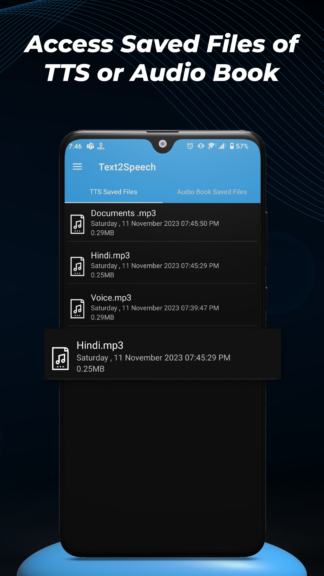 Conveniently browse through your saved audio files generated by TTS.