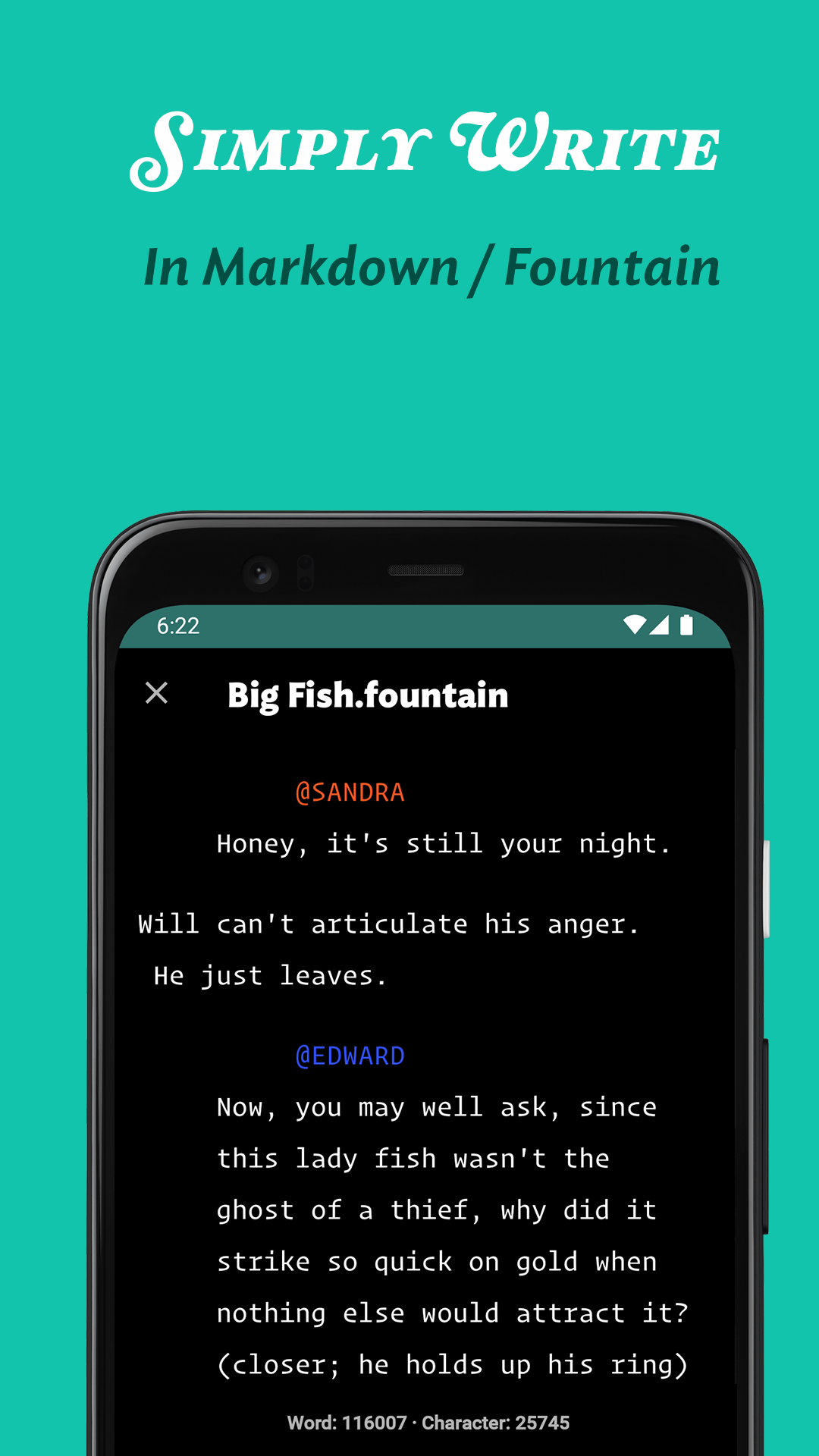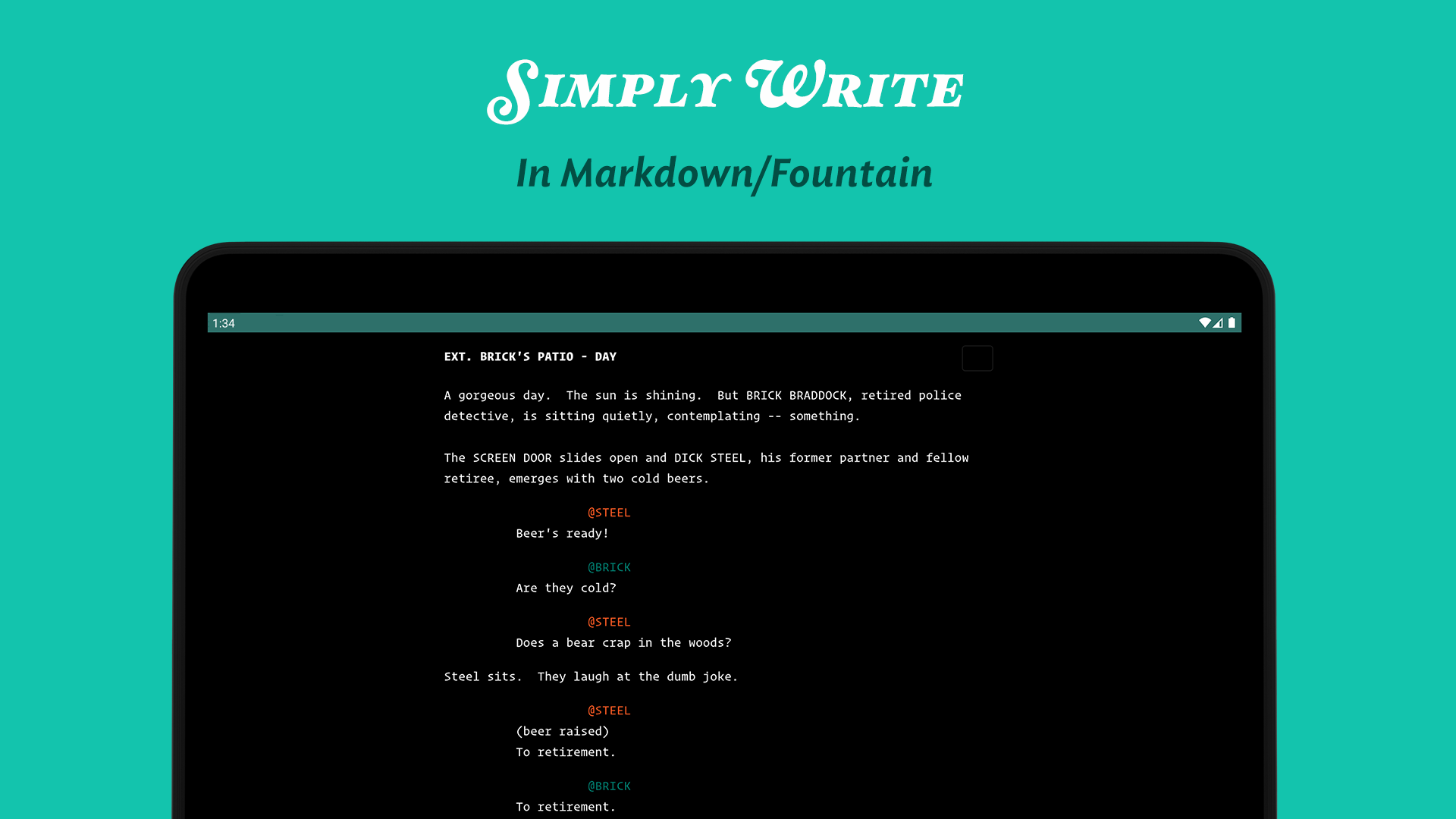 Focus on your written words while JotterPad takes care of turning your Fountain script into a professional screenplay. You can export your work as a Final Draft (.fdx) file or a PDF. Explore additional screenwriting tools available in JotterPad Pro Cloud.
