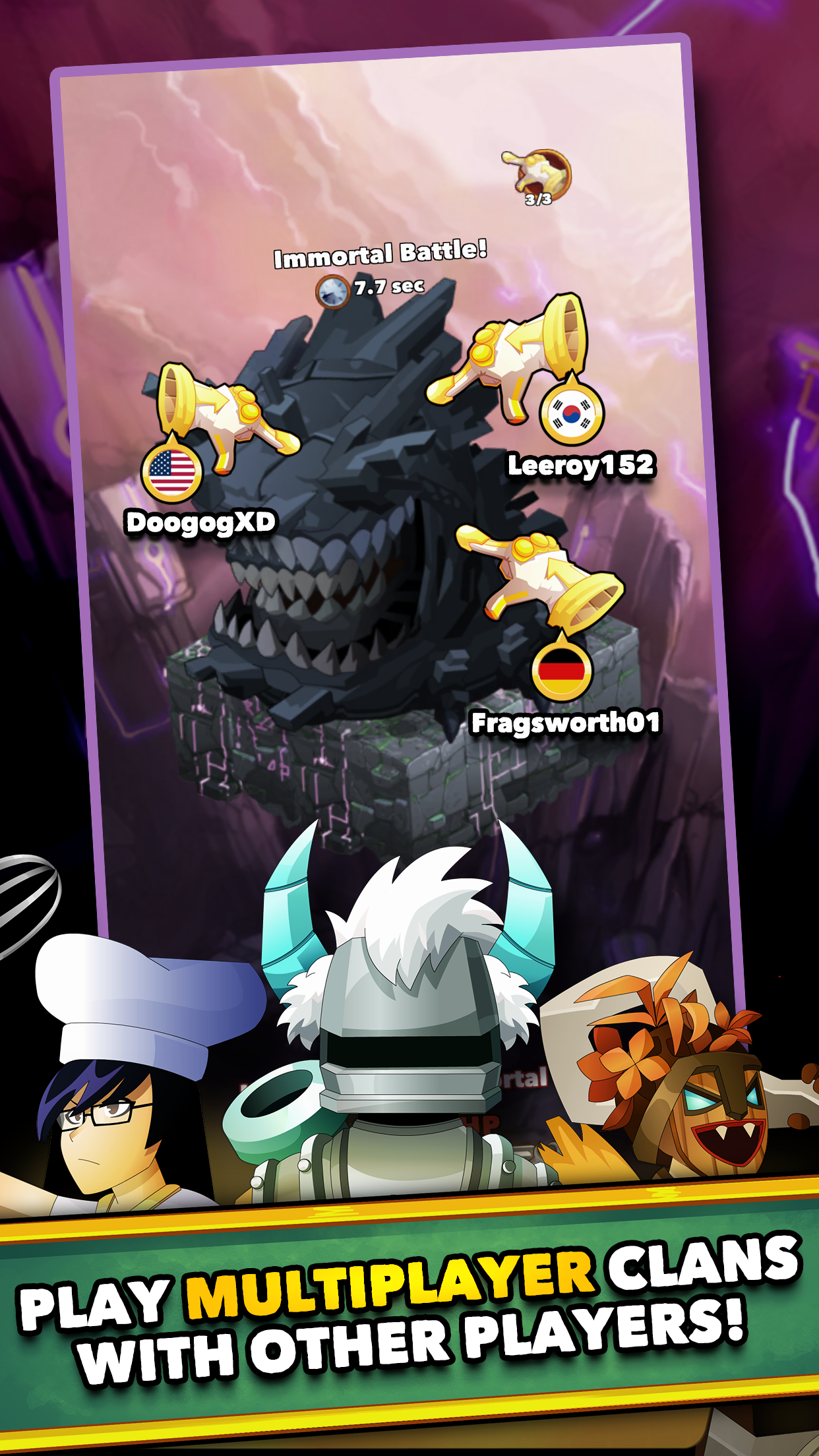 Players can explore over 1,000 stages, challenging bosses, and various monsters. As players progress, they level up heroes that assist in combat, boasting unique skills and nine active abilities usable in battles. Collecting Ancient collectibles enhances firepower stats and upgrades improve damage inflicted through clicking.