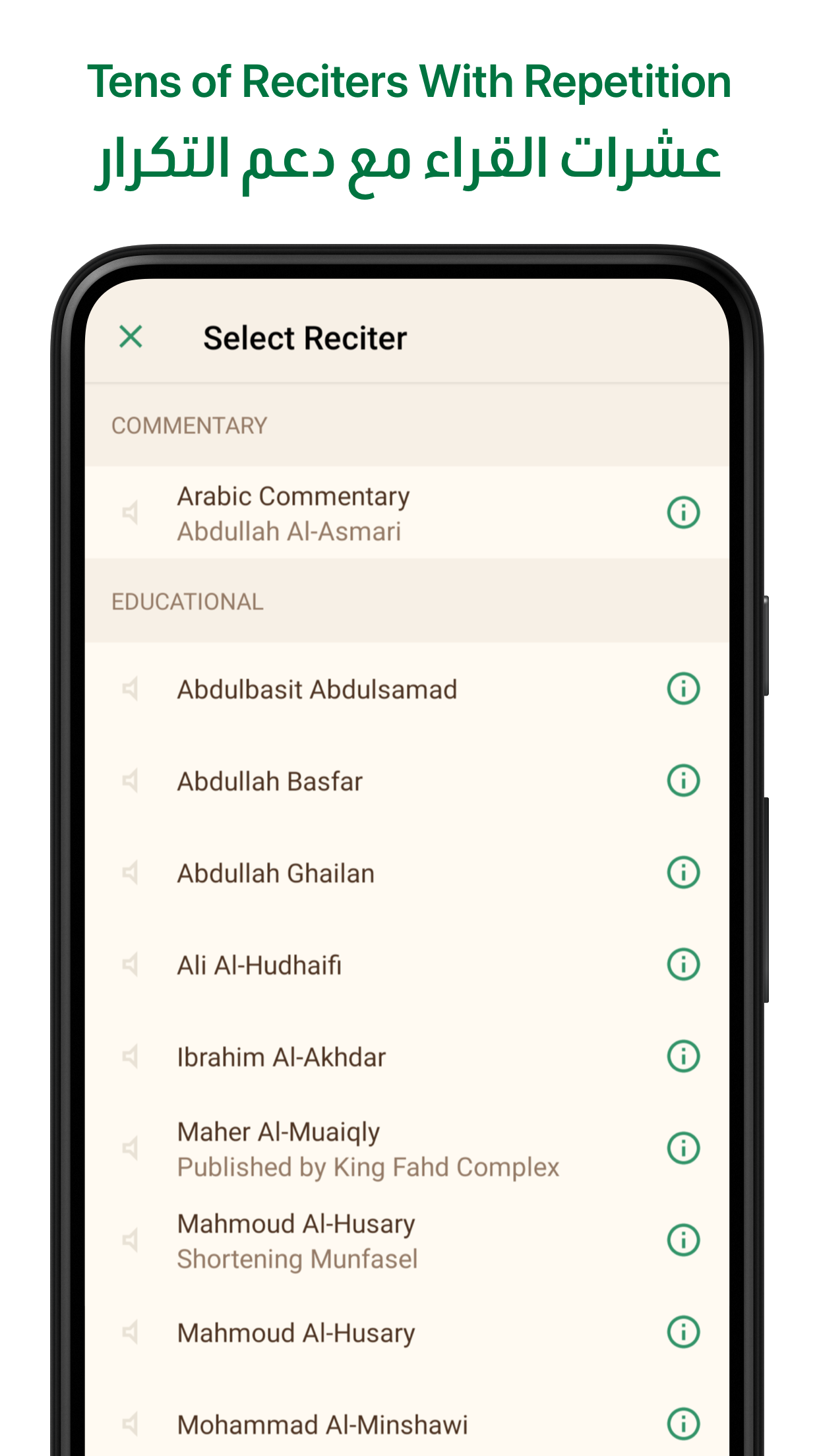 Experience gapless verse-by-verse recitation from selected reciters, with options for background playback, adjustable repeat settings, and a sleep timer.