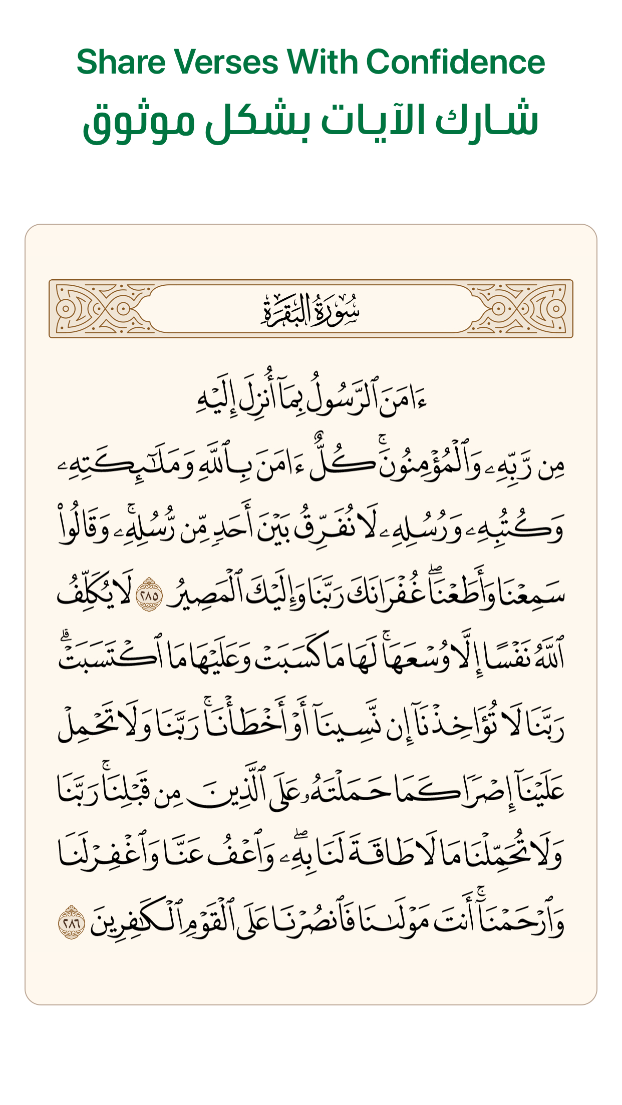 Share verses quickly by sending them as text or images using the beautiful Uthmani font.